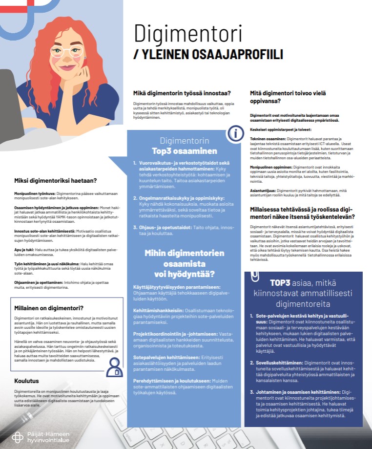 Digimentorit auttavat yksiköitä arkea helpottavien digiratkaisujen käyttöönotossa ja lisäävät tietoisuutta käytettävissä olevista digipalveluista ja -työkaluista. Digimentorit tukevat henkilökuntaa digiosaamisen kehittämisessä sekä auttavat digityökalujen haltuunotossa, jotta digipalvelut nivoutuisivat osaksi päivittäistä työtä. Rajauksena voidaan digimentoroinnille asettaa, että digimentorit eivät ole teknisiä asiantuntijoita, eli heillä ei tule olla syväymmärrystä digiratkaisun teknisistä ominaisuuksista ja kehittämisestä. Sen sijaan digimentorit ovat digiratkaisun käytön ja toimeenpanon asiantuntijoita.