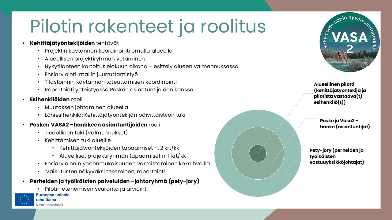 Jokaisessa pilotissa työskentelee kehittäjätyöntekijä, jonka tehtävänä on kehittämistyön käytännön toteuttaminen, tiedonkeruu ja erityisesti yhteisesti luodun toimintamallin juuruttaminen omalla alueellaan. Kehittäjätyöntekijöiden työtä on koordinoitu ja tuettu VASA2 -hankkeen asiantuntijoiden toimesta. Kehittämistyön rakenteista ja eri toimijoiden rooleista on sovittu hankkeen asiantuntijoiden ja esihenkilöiden kanssa erillisessä perehdytyspäivässä pilottien käynnistymisen yhteydessä 8/24. Kuvassa avattu tarkemmin kehittämistyön rakenteita, joilla on ollut keskeinen rooli kehittämistyön onnistumisessa näin ison ja laajan alueen toimintakäytäntöjen yhtenäistämisessä. VASA2 hanke on lisäksi vastanneet tiedonkeruusta ja raportoinnista kokonaisuutena sekä pilottien vaikutusten arvioinnista sekä perheiden ja työikäisten palveluiden johdon osallistamisesta kehittämistyöhön.