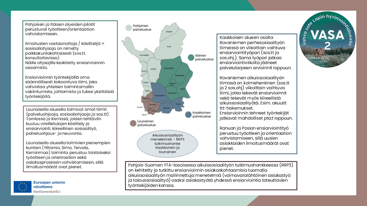 Lapin hyvinvointialue on jaettu neljään palvelualueeseen, joissa perheiden ja aikuisten palvelut on järjestetty eri tavoin riippuen asiakasmääristä sekä työntekijäresursseista. Tästä johtuen ensiarviointityöskentely (vireilletulojen käsittely -prosessi) on organisoitu alueen rakenteisiin sopivalla tavalla. Alueen isoimmissa kaupungeissa Rovaniemi, Kemi ja Tornio kehittämistyötä tehtiin organisoimalla kokonaan uusia rakenteita tai tarkastelemalla ja kehittämällä olemassa olevia. Itäisellä ja Pohjoisella palvelualueella sovittiin tarkemmin vastuista työntekijöiden kesken sekä kirkastettiin kokonaisuudessaan sosiaalihuoltolain mukaista asiakasprosessia.