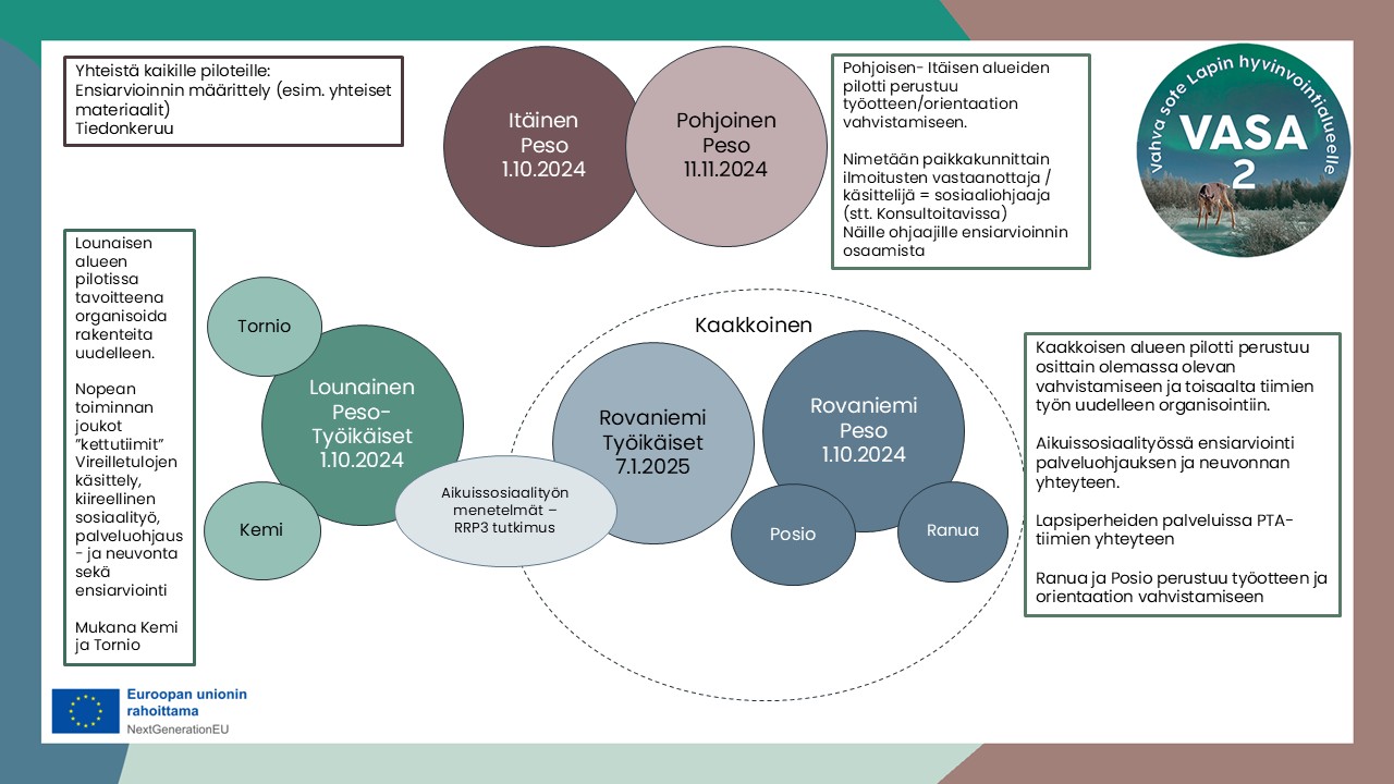 Suomen kestävän kasvun ohjelman mukainen kehittämistyö (RRP, VASA2 -vahva sote Lapin hyvinvointialueelle) Lapin hyvinvointialueella tukee Lapin hyvinvointialueen strategiaa ja palvelustrategiaa. VASA2- hankkeen tavoitteena on kehittää sote -palveluiden saatavuutta ja hoitoon pääsyä, mm. Sopimalla, rakentamalla ja mallintamalla heikoimmassa ja haavoittuvassa asemassa olevien asiakas- ja potilasryhmien hoito- ja palveluketjut sekä ennalta ehkäisevät toimintamallit hyvinvointialueen strategian ja uuden organisaation toiminnan tueksi sekä kehittää heikoimmassa ja haavoittuvassa asemassa olevien asiakas- ja potilasryhmien palveluita niin, että hoitoon ja palvelun piiriin pääsy nopeutuu ja hoidon ja palveluiden jatkuvuus saadaan turvattua.