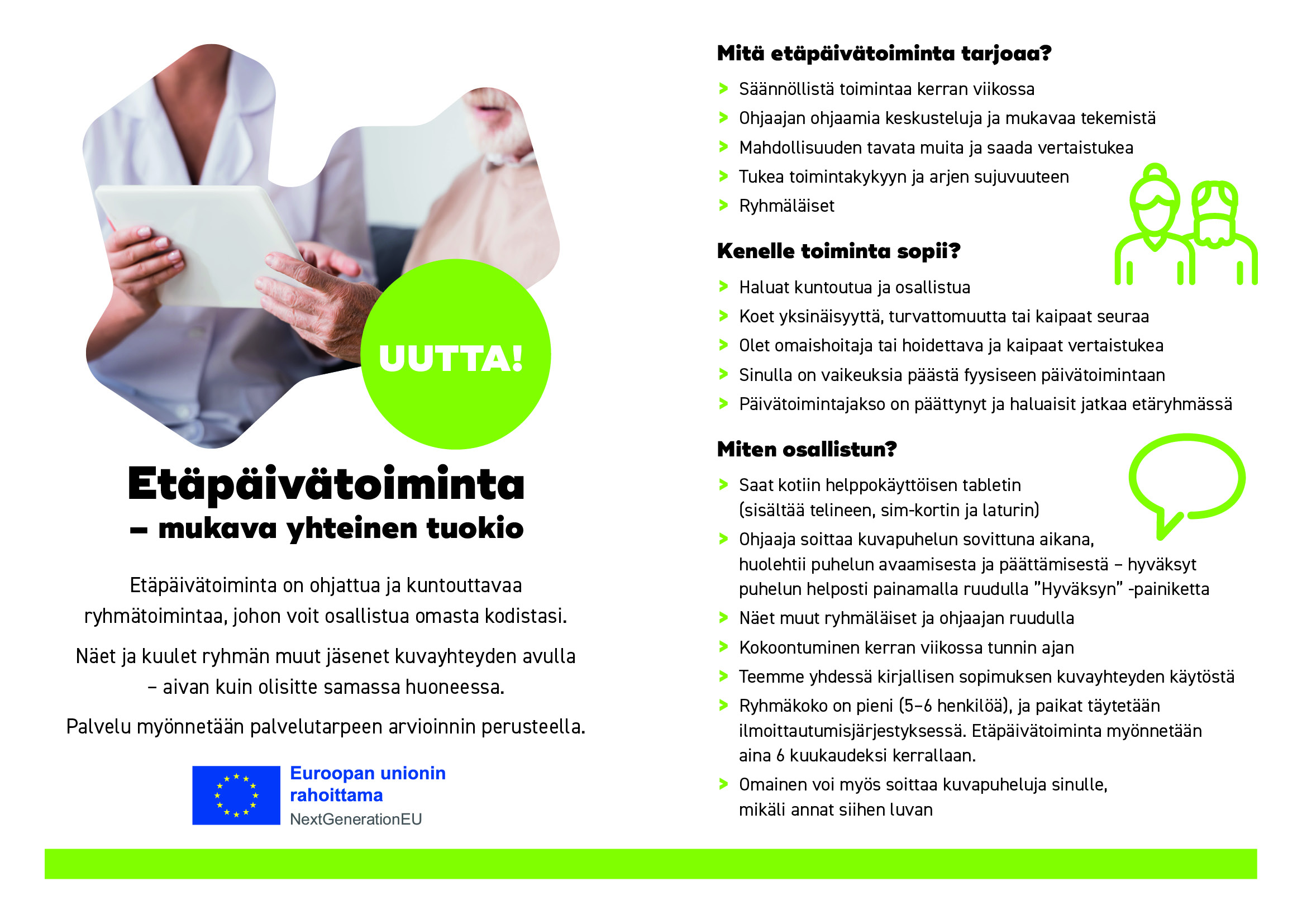 Päivätoiminta on tärkeäksi koettu tukipalvelu kotona asumisen ja toimintakyvyn ylläpysymisen tukena, johon asiakas saapuu kotoa ja palaa kotiin. Kotoa lähteminen on joillekin vaikeaa tai mahdotonta, vaikka toimintaan on muuten motivoitunut. Asiakas osallistuu ryhmään kerran viikossa helppokäyttötabletin avulla. Ohjattu toiminta tukee ikääntyneiden kotona asumista, tarjoaa mahdollisuuden osallisuuteen ja ennaltaehkäisee yksinäisyyttä. Ryhmäläiset itse suunnittelevat kerran viikossa tunnin toteutettavien ryhmien sisällöt yhdessä ohjaajan avustuksella. Suosittuja aiheita ovat musiikki, luontoaiheet, ikääntymiseen sopeutumisesta keskustelu sekä ajankohtaisaiheet.