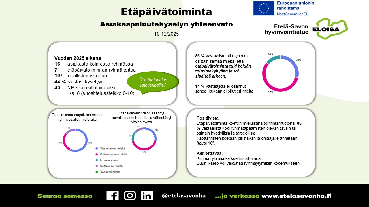 Etäpäivätoimintaa testattiin pienimuotoisesti ensimmäistä kertaa Ikääntyneiden tilannekuva-hankkeessa 2021-2023 osana KATI-kehittämisohjelmaa. Tuloksena oli, että ikääntyneet ovat valmiita osallistumaan etänä toteutettavaan ryhmätoimintaa, kun teknologia on toimivaa. RRP2-hankkeessa 2024 vuoden lopulla koottiin Etelä-Savon laajuinen testiryhmä, jossa arvioitiin voidaanko ryhmien ohjaus toteuttaa oppilaitosten, seurakunnan ja järjestöjen kanssa ja mitä se vaatii. Kokeilun jälkeen palautekyselyyn osallistuivat oppilaitoksen oppilaat, päivätoiminnan ohjaajat ja asiakkaat. Palaute antoi tärkeää tietoa siitä, ketkä asiakkaat hyötyvät etäpäivätoiminnasta.