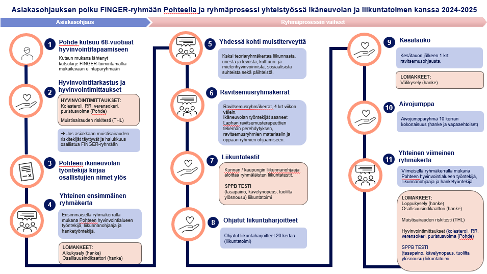 Pohjois-Pohjanmaan alueella tehdään FINGER-toimintamallia mukailevan elintapaohjauksen yhteiskehittämistä Pohteen Ikäneuvolatoiminnan sekä pilottialueiden liikuntatoimien kanssa. Merkittävää on tunnistaa muistisairauden riskiryhmään kuuluvat henkilöt, jotka voidaan ohjata FINGER-elintaparyhmään. Liitteenä asiakaspolkukuvaus.