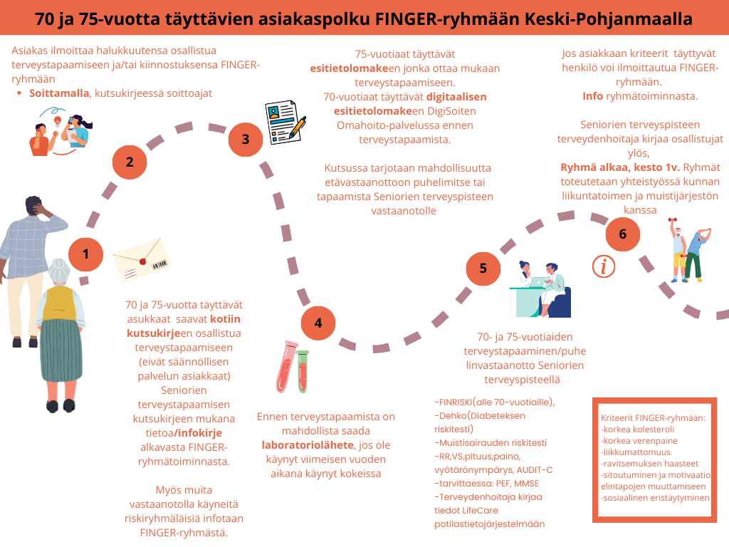 Keski-Pohjanmaan alueella tehtiin FINGER-mallia mukailevan elintapaohjauksen yhteiskehittämistä Keski-Pohjanmaan hyvinvointialueen(Soiten) Seniorien terveyspisteiden ja pilottialueiden liikuntatoimien kanssa. Liitteenä asiakaspolkukuvaus.