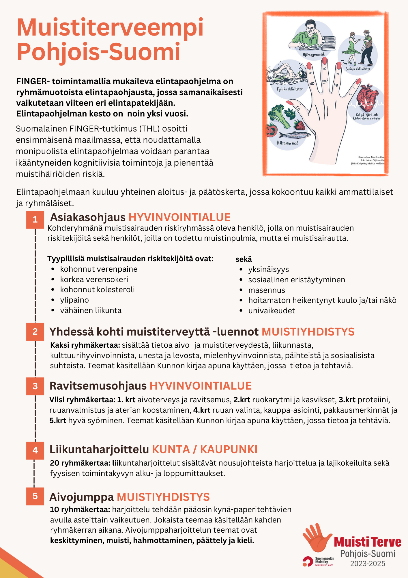 MuistiTerve Pohjois-Suomi 2023-2025 -hankkeen aikana FINGER‑toimintamallia mukailevaan elintapaohjelmaan osallistuneet ryhmäläiset ovat päässeet kehittämään elintapaohjelmassa käytettäviä materiaaleja. Tietoa elintapaohjelman toimivuudesta on kerätty systemaattisesti yhteistyökumppaneilta ja ryhmäläisiltä ja toimintaa on muokattu palautteiden perusteella.