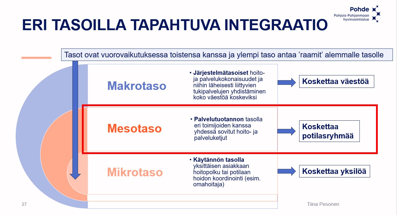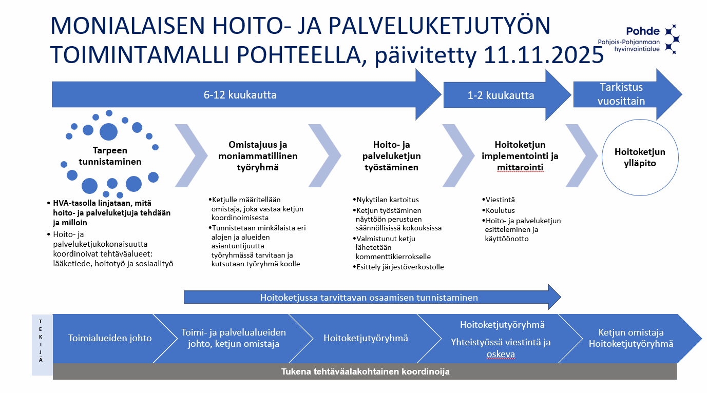 Pohjois-Pohjanmaan hyvinvointialueella on käynnissä hoito- ja palveluketjujen kehittämishanke, jonka tavoitteena on tunnistaa hoitoketjutyön kehittämistarpeet sekä rakentaa toimintamalli monialaiselle hoito- ja palveluketjutyölle.