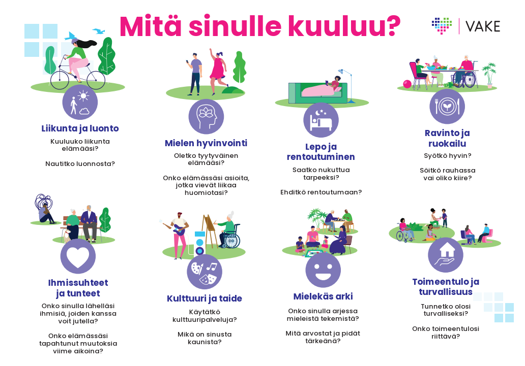 - Vahvistamme hyvinvointia ja turvallisuutta (Vanhusten toimintakykyä tuetaan ja elämänlaatua parannetaan järjestämällä yksilöllisiä, ennakoivia ja ennaltaehkäiseviä palveluja)