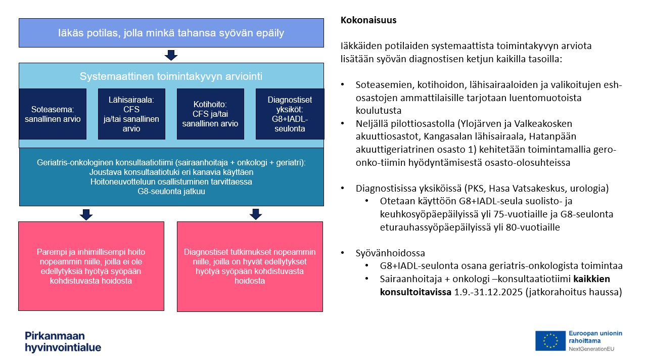 Hankkeessa aloitetaan systemaattinen yli 75-vuotiaiden potilaiden toimintakykyseulonta ennen kajoavia toimenpiteitä kolmessa Pirkanmaan hyvinvointialueen diagnostisessa yksikössä (keuhkosairauksien ja urologian poliklinikat sekä Hatanpään Vatsakeskus) sekä perustetaan uusi moniammatillinen geriatrisonkologinen konsultaatiotiimi tarjoamaan syövänhoidon osaamista ja päätöksenteon tukea hyvinvointialueen kaikille ammattilaisille. Tiimissä työskentelee syöpäsairaanhoitaja ja syöpälääkäri läheisessä yhteistyössä geriatrin kanssa. Hankkeessa järjestetään koulutusta iäkkään potilaan toimintakyvyn arvioinnista lähettäville tahoille eli soteasemille, ikäihmisten palveluihin ja lähisairaaloihin. Lähisairaaloissa neljällä osastolla pilotoidaan toimintamallia iäkkään potilaan toimintakyvyn arvioinnissa ja geriatrisonkologisen tiimin hyödyntämisessä.