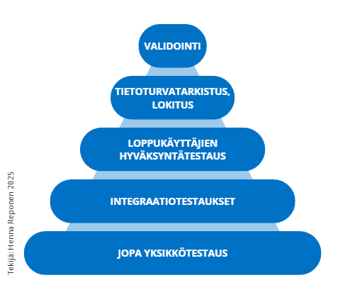 Testauskokonaisuus sisälsi useita tasoja: yksikkötestaukset, integraatiotestaukset, tietoturvatarkistuksen sekä loppukäyttäjien hyväksyntätestaukset.