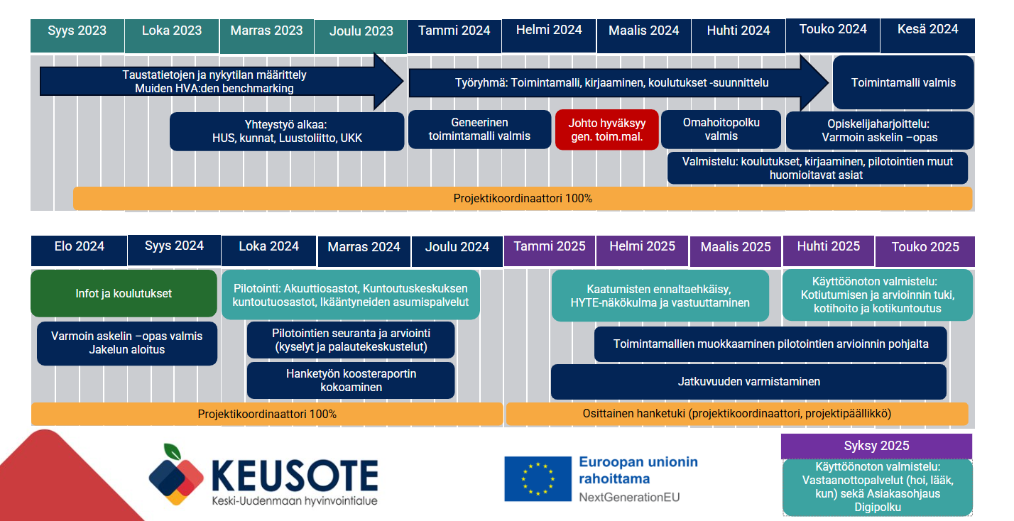 Lisäksi kaatumisten ehkäisystä, omahoitopolusta ja Varmoin askelin -oppaasta sekä toimintamallien pilotoinnista viestitään runsaasti Keusoten sisäisesti ja ulkoisesti.