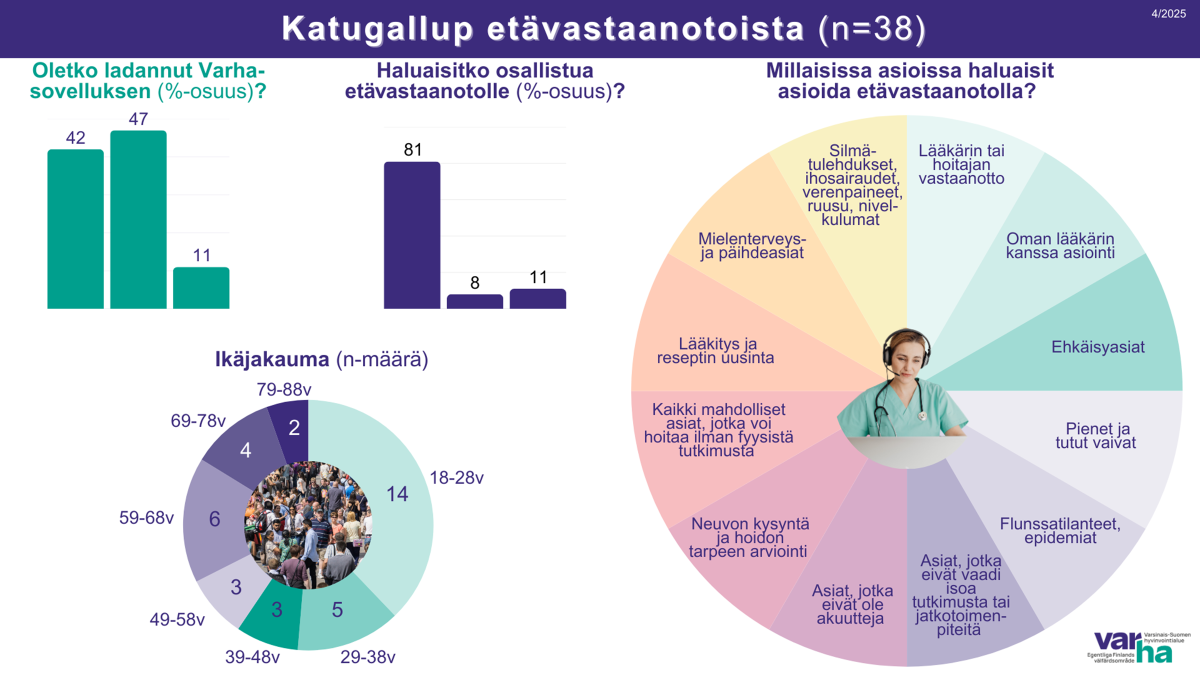Katugallup toteutettiin kahtena ajankohtana Turun kävelykadulla, jossa kohdatuilta kansalaisilta selvitettiin, millaisia asioita he haluaisivat hoitaa etävastaanotolla Varha-sovelluksessa, jos se olisi mahdollista. Tuloksista tehtiin yhteenveto, joka käytiin etävastaanottotiimin kanssa läpi. Tuloksia hyödynnettiin etävastaanottojen käyttöönoton tehostamisessa.
