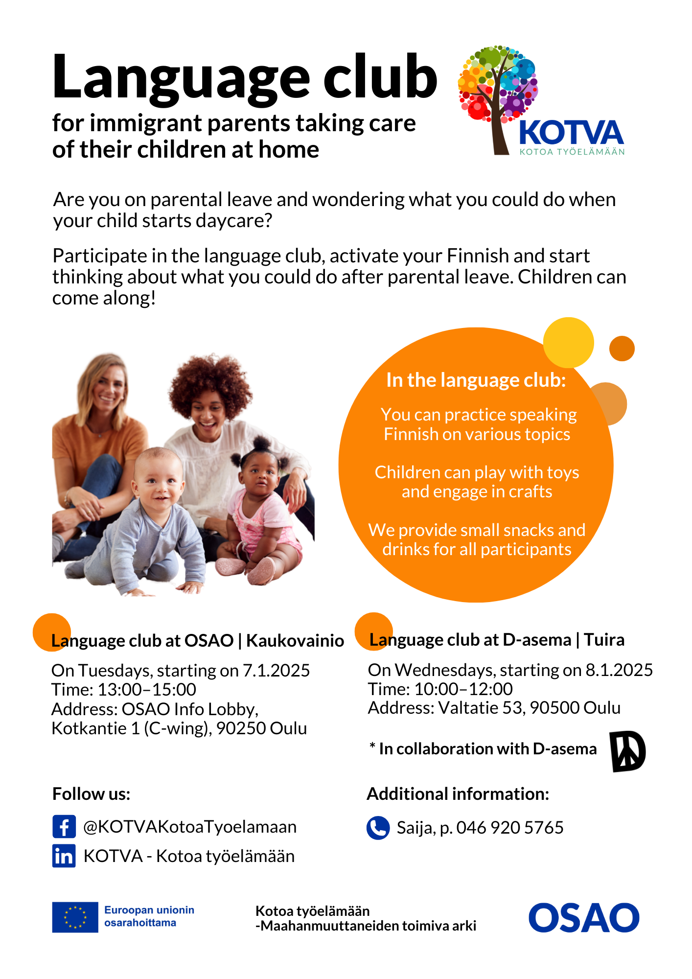 Ilman riittävää kielitaitoa ja tietoa vaihtoehdoista oman polun rakentaminen työelämään on haastavaa. Monikanavaisen, arkeen sopivan ja helposti lähestyttävän viestinnän avulla luotiin yhteys kohderyhmään sekä herätettiin kiinnostusta suomen kielen oppimiseen kielikerhossamme ja tulevaisuuden suunnitteluun valmennuksessamme – esimerkiksi koulutuksen, työpaikan tai lapsen päivähoidon näkökulmasta. Tällainen yhteys voi antaa suuntaa ja vahvistaa uskoa siihen, että omat tavoitteet ovat saavutettavissa, samalla tukien vanhempia matkalla kohti koulutusta, työelämää ja aktiivista osallistumista yhteiskuntaan.