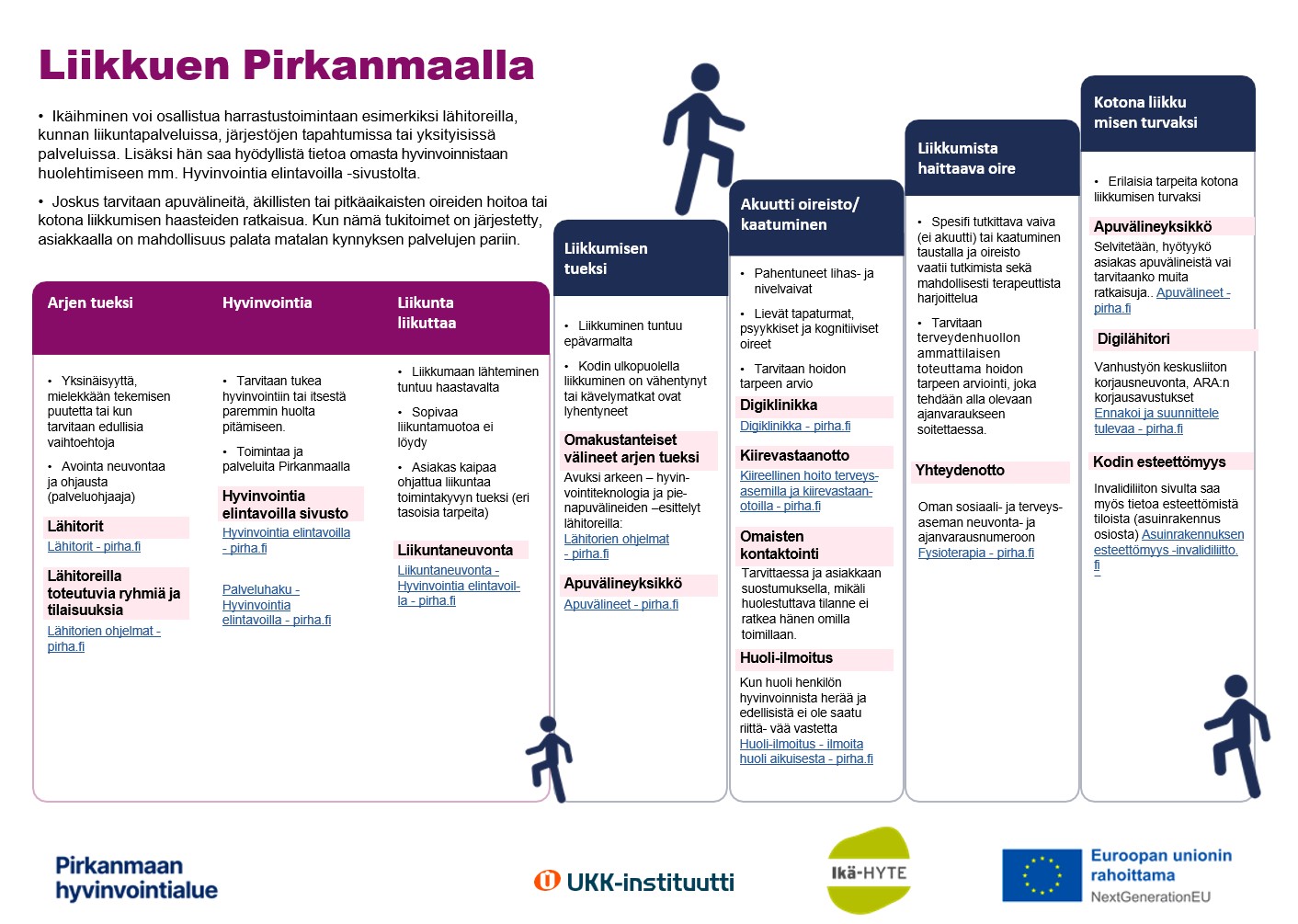 Liikkumisen portaat antavat ammattilaiselle keinoja ikääntyneen liikkumisen tukemiseen Pirkanmaalla. Portaat sisältävät matalan kynnyksen palveluja sekä tukipalveluja (esim. apuvälineet, akuutti oireisto), kun liikkumisessa on haasteita.