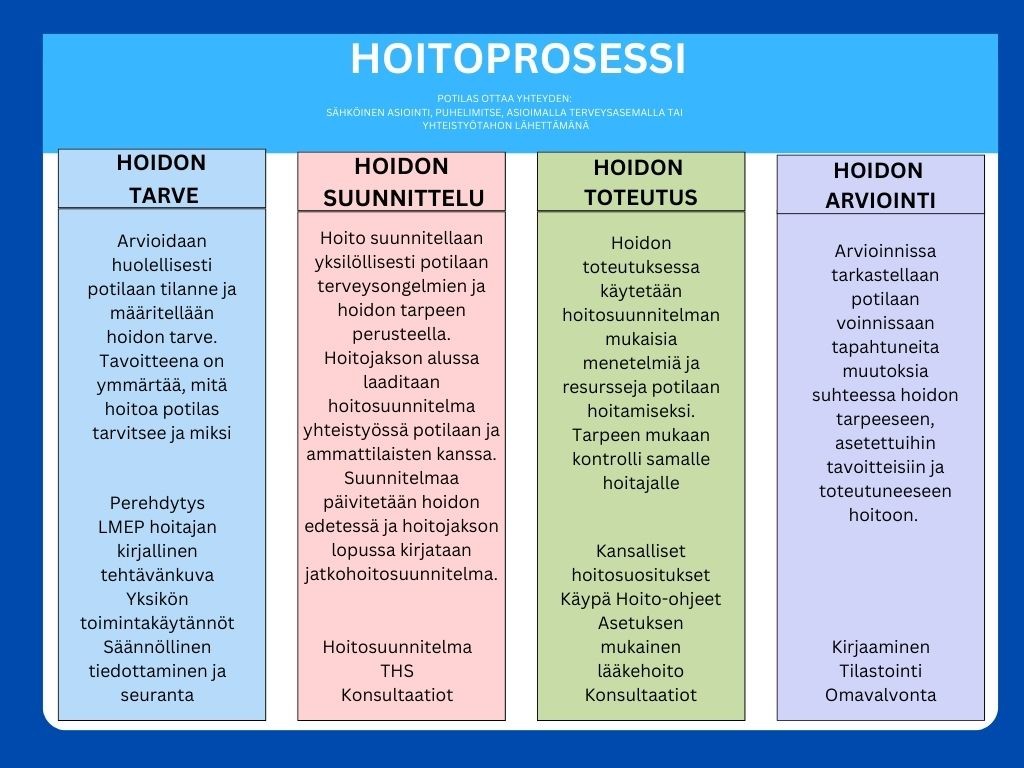 - Tavoitteena oli kehittää potilaiden ohjautumista oikealle ammattihenkilölle oikea-aikaisesti -> lääkkeenmääräämishoitajien osaamisen parempi hyödyntäminen
