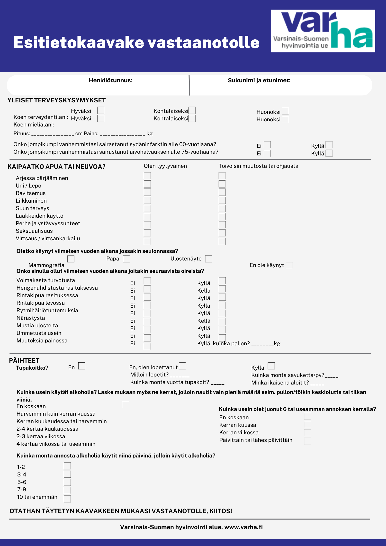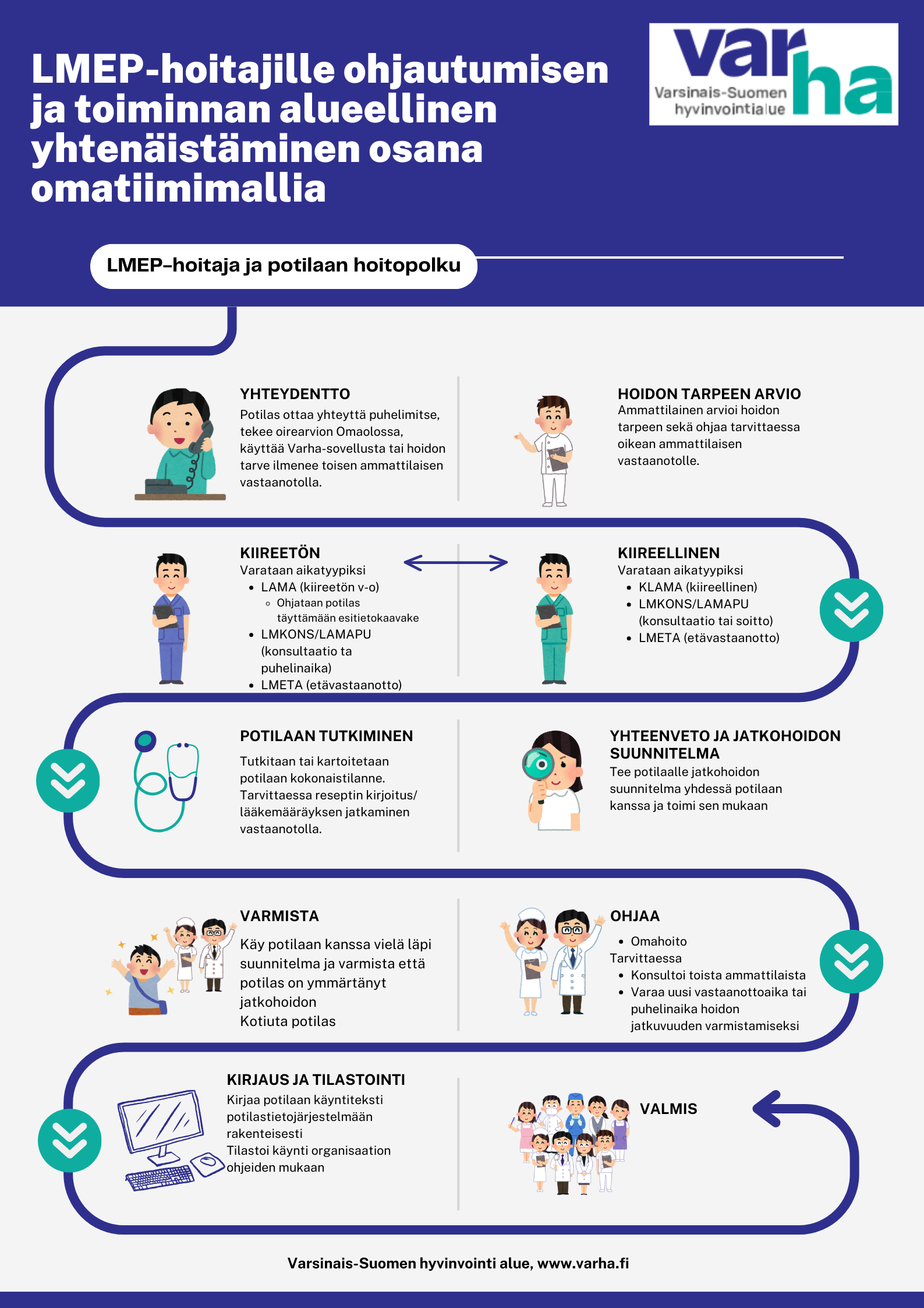 Lisäksi alueelle otetaan käyttöön yhteinen tilastointiohje, jonka avulla LMEP-hoitajien toimintaa ja hoidon ohjautuvuutta voidaan seurata ja arvioida yhdenmukaisesti. Osana toimintamallia on laadittu myös yhteinen esitietokaavake pitkäaikaissairaiden potilaiden hoitoon. Potilas täyttää esitietokaavakkeen ennen vastaanotolle tuloa toimipisteessä tai Varha-sovelluksessa. Esitietokaavakkeen tavoitteena on tukea potilasta oman terveydentilansa ja hoidon tarpeidensa pohtimisessa sekä mahdollistaa vastaanotolla keskittyminen potilaan yksilöllisiin tarpeisiin kokonaisvaltainen tilanne huomioiden.