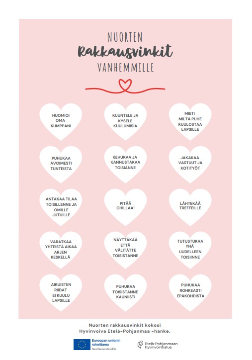 Parisuhde-teemalla pidetyn verkkovanhempainillan - Pyykkivuorten ja pusujen välissä - sisällön toteutukseen osallistui myös Etelä-Pohjanmaan hyvinvointialueelle palkatut nuoret, jotka toimivat JuniorDigiagentteina esittelemässä ja opastamassa alueen asukkaita OmaEP-digipalvelun käytössä eri puolilla maakuntaa. JuniorDigiagenttien toimintamalliin voit tutustua oheisen linkin kautta. Nuorille järjestettiin kesätyöjakson lopussa Learning cafe -tyyppinen työpaja, missä yhtenä tehtävänä oli koota nuorten rakkausvinkkejä vanhemmille. Parisuhde- vanhempainillassa oli kaksi nuorta esittelemässä rakkausvinkkejä ja niistä painettiin myös postikortteja ja julisteita. Rakkausvinkeistä tehtiin myös video, mihin voit tutustua oheisen linkin kautta.