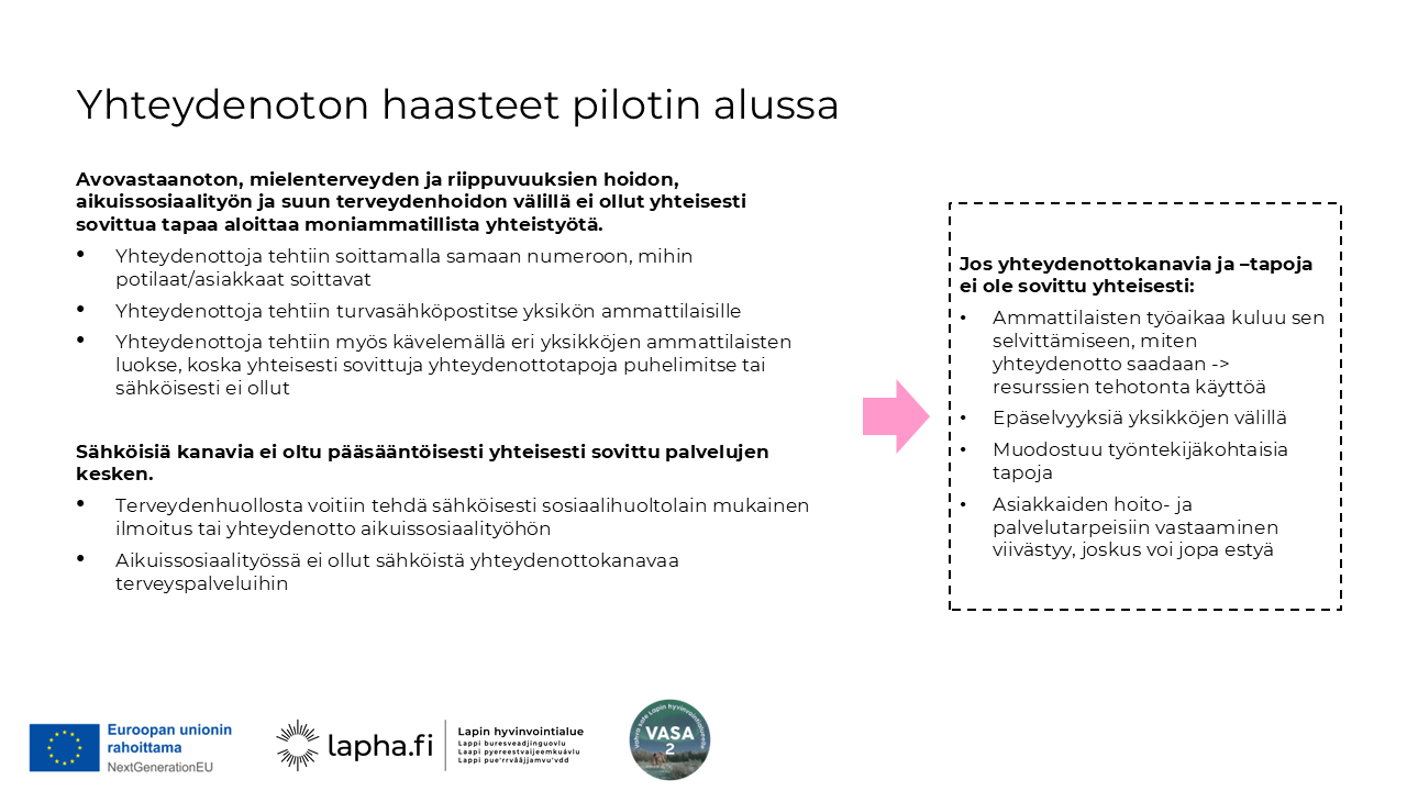 Mallin käyttöönottoa laajennettiin itäisellä palvelualueella Sodankylästä Kemijärvelle moniammatillisen yhteistyön pilotissa ajalla 3/20258/2025. Pilotin/käyttöönoton asiakas/potilaskohderyhmänä oli 18-64-vuotiaat henkilöt, joilla on päihde- ja/tai riippuvuusongelmia.