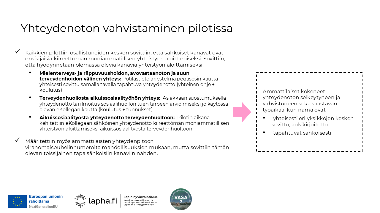 - Pilotin ajan kokoontui kuukausittain 1,5h ajan etänä moniammatillinen työryhmä: Tunnistettiin kehittämisen paikkoja sekä toimivia käytänteitä sekä miten yhteistyö vahvistui pilotin aikana