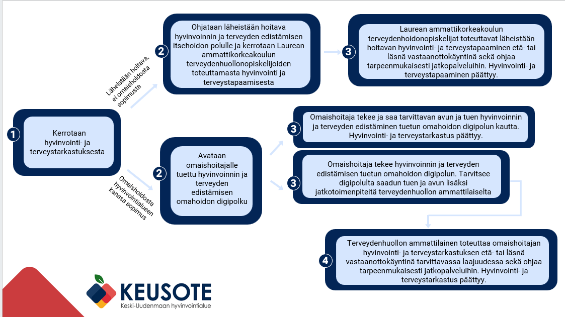Läheistään hoitava varaa Laurean ammattikorkeakoulun terveydenhuollonopiskelijoiden toteuttamaan hyvinvointi- ja terveystapaamiseen ajan. Tapaaminen voidaan toteuttaa etä- tai läsnävastaanottokäyntinä.