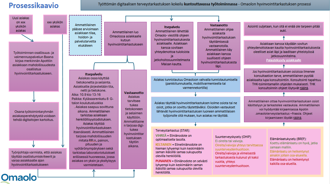 Omaolon hyvinvointitarkastuksen kokeilut toteutettiin elo-marraskuun aikana Helsingin kuntouttavan työtoiminnan asiakkaille. Kokeilun aikana selvitettiin Omaolon hyvinvointitarkastuksen käytettävyyttä prosessissa sekä pyrittiin tunnistamaan ne asiakasryhmät, jotka hyötyvät Omaolon ohjaavammasta otteesta/itsehoito-ohjeista ja tiedosta sekä valmennuksista. Kokeilujen edetessä kohderyhmää laajennettiin Työnkyvyn tuen palvelun aikuissosiaalityön asiakkaisiin.