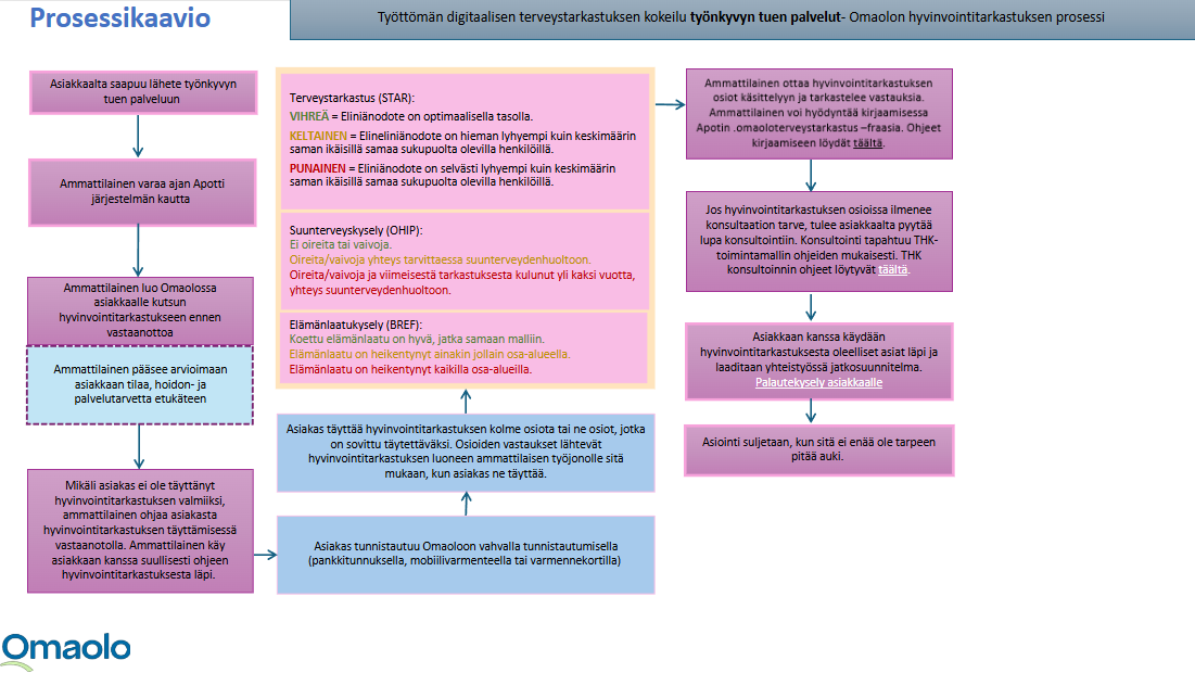 Omaolon hyvinvointitarkastus (hvt) on digitaalinen työkalu, jolla voidaan kartoittaa asiakkaan terveyttä, elämänlaatua ja terveysriskejä laaja-alaisesti. Tavoitteena on, että hvt:ta hyödynnetään osana työttömän terveystarkastusprosessia Helsingissä.