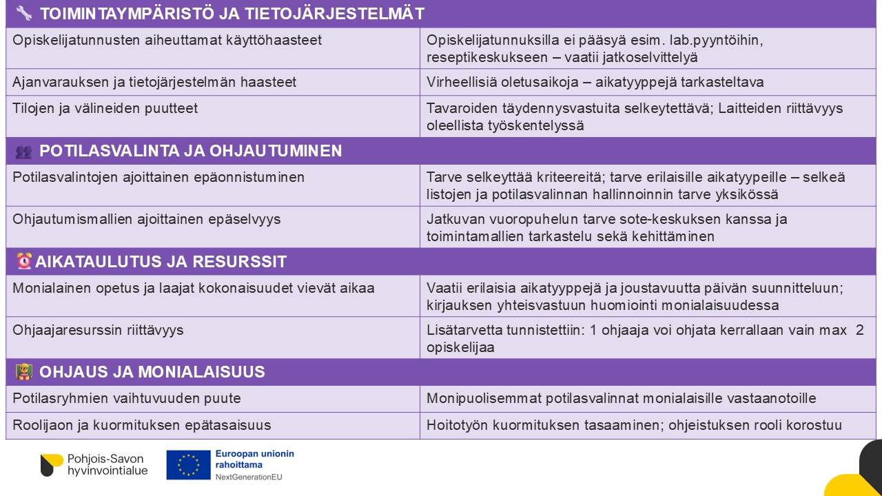 - Opetusvastaanoton asiakkaat: Opetusvastaanotolla kohdataan perusterveydenhuollon asiakkaita. Pilottivaiheen asiakasryhmiä ovat esimerkiksi yhden asian asiakkaat, kertaluonteiset käynnit, kansansairauksien määräaikaistarkastukset, yksinkertaiset toimenpiteet. Lisäksi mukana olevien koulusohjelmien opintojaksokohtaiset tarpeet tulee huomioida.
