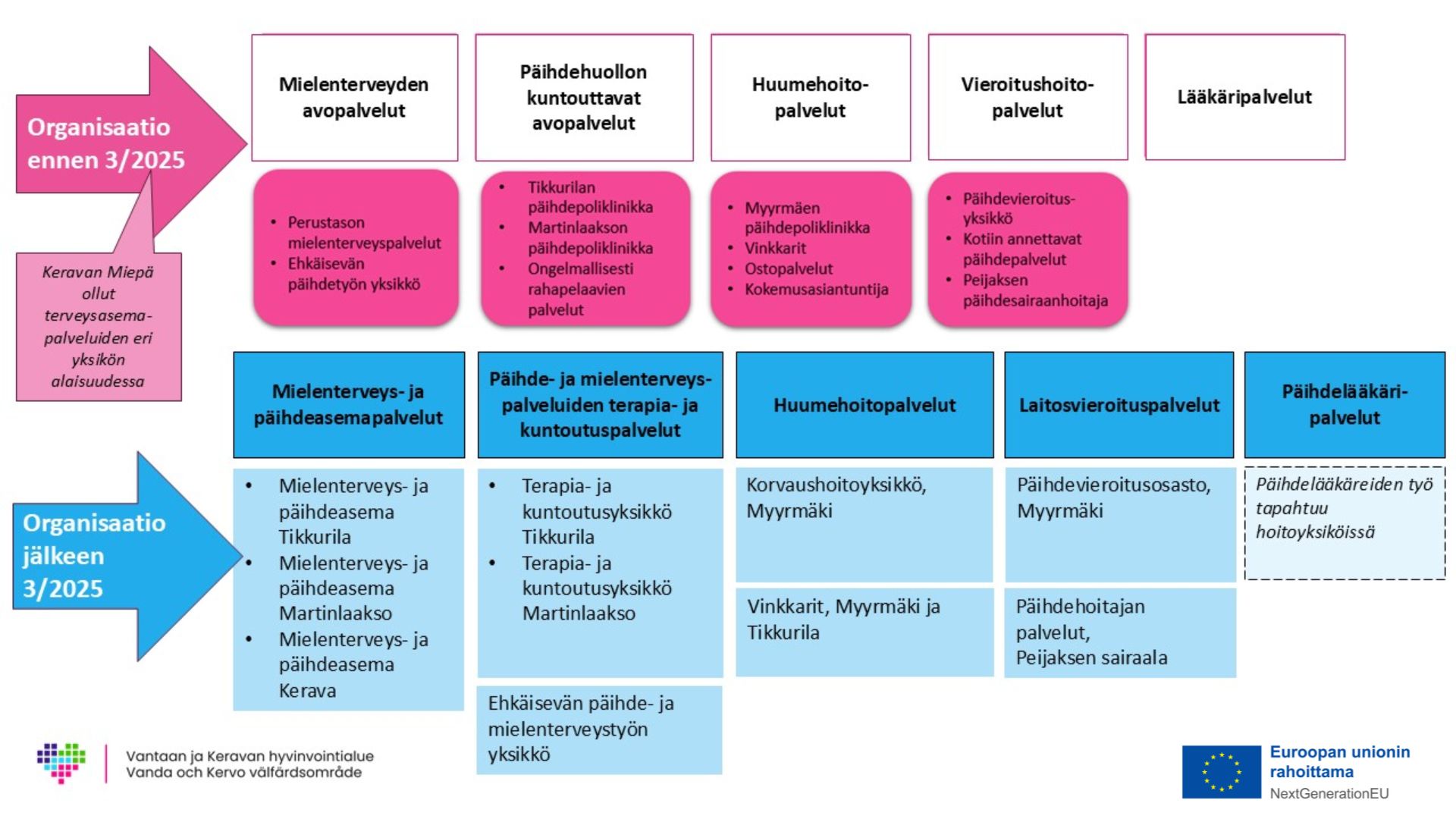 Toimintaympäristönä toimii Vantaan ja Keravan hyvinvointialue. Uudistus koskee päihde- ja mielenterveyspalveluiden tehtäväaluetta, mutta tiivis yhteys terveysasemiin ja sosiaalipalveluihin on olennainen, sillä päihde- ja mielenterveystyö kytkeytyy vahvasti osaksi muuta palvelukokonaisuutta.
