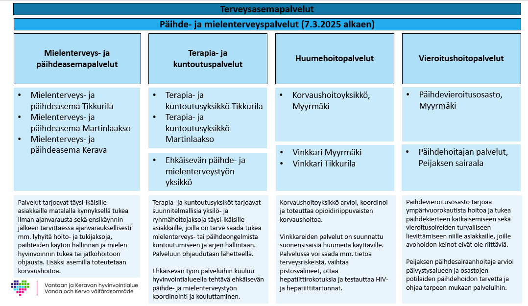 Mielenterveys- ja päihdeasemien matalan kynnyksen palvelua on pilotoitu erillisenä kehittämiskokonaisuutena Vantaan ja Keravan hyvinvointialueella: Matalan kynnyksen mielenterveys- ja päihdepalvelu terveysasemalla, Vantaan ja Keravan HVA (RRP, P4, I1) | Innokylä