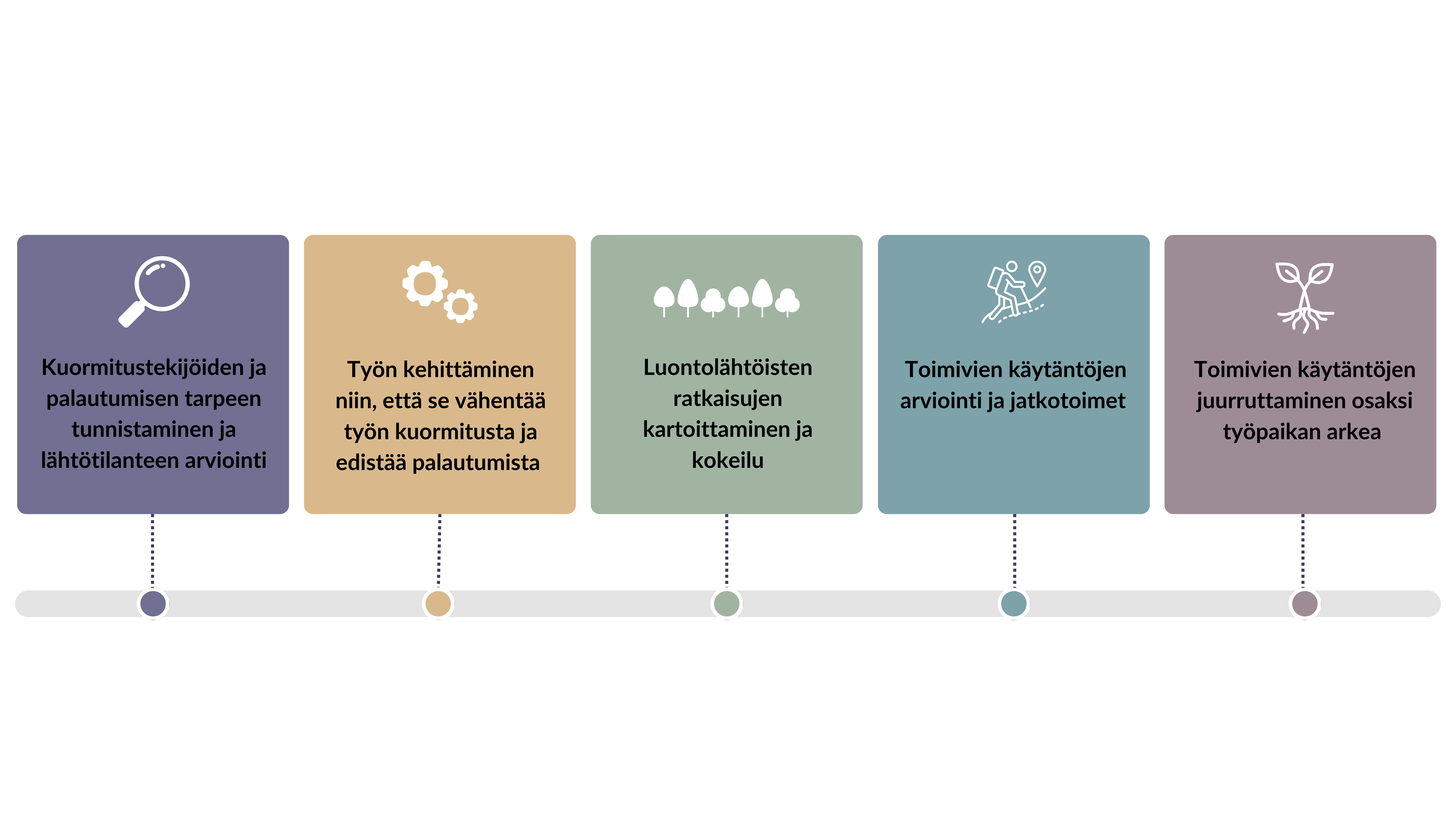 Toimintamalli kuvaa työstä palautumista edistäviä tekijöitä työssä, työolosuhteissa ja työn organisoinnissa sekä luonnon hyödyntämistä palautumisen tukena. Toimintamallin käyttöönoton tueksi on laadittu työkirja, jossa on materiaalia ja harjoituksia.