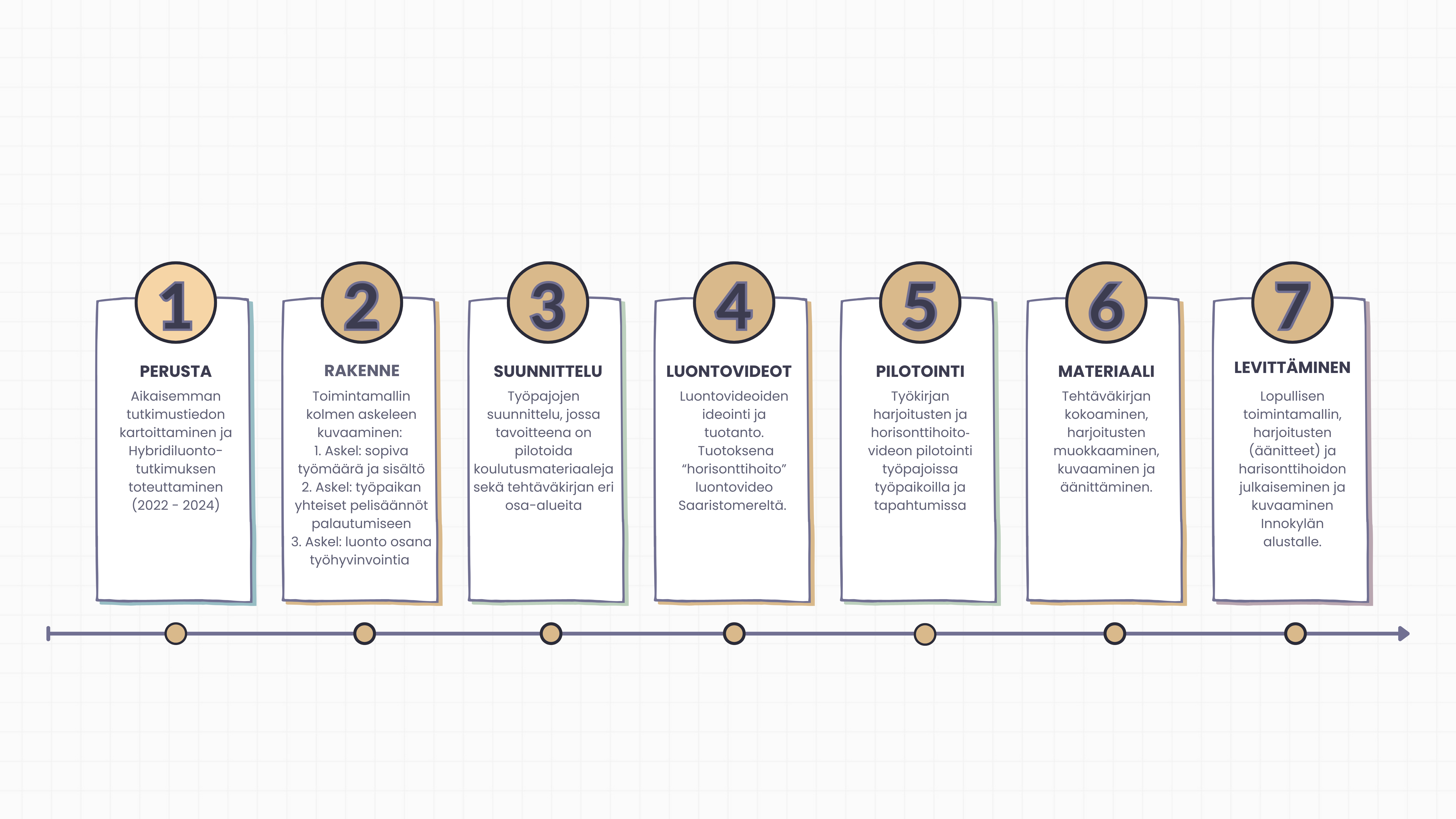 Toimintamallin kehitystyö on edennyt vaiheittain suunnitellun toteutussuunnitelman mukaisesti. Prosessi eteni seitsemässä vaiheessa (ks. kuvio). Työ käynnistyi tutkimustiedon kokoamisella ja toimintamallin rakenteen luomisella, minkä jälkeen edettiin työpajojen suunnitteluun, materiaalien ja luontovideoiden tuottamiseen sekä pilotointiin. Lopuksi valmis toimintamalli harjoituksineen ja materiaaleineen viimeisteltiin ja levitettiin laajempaan käyttöön.