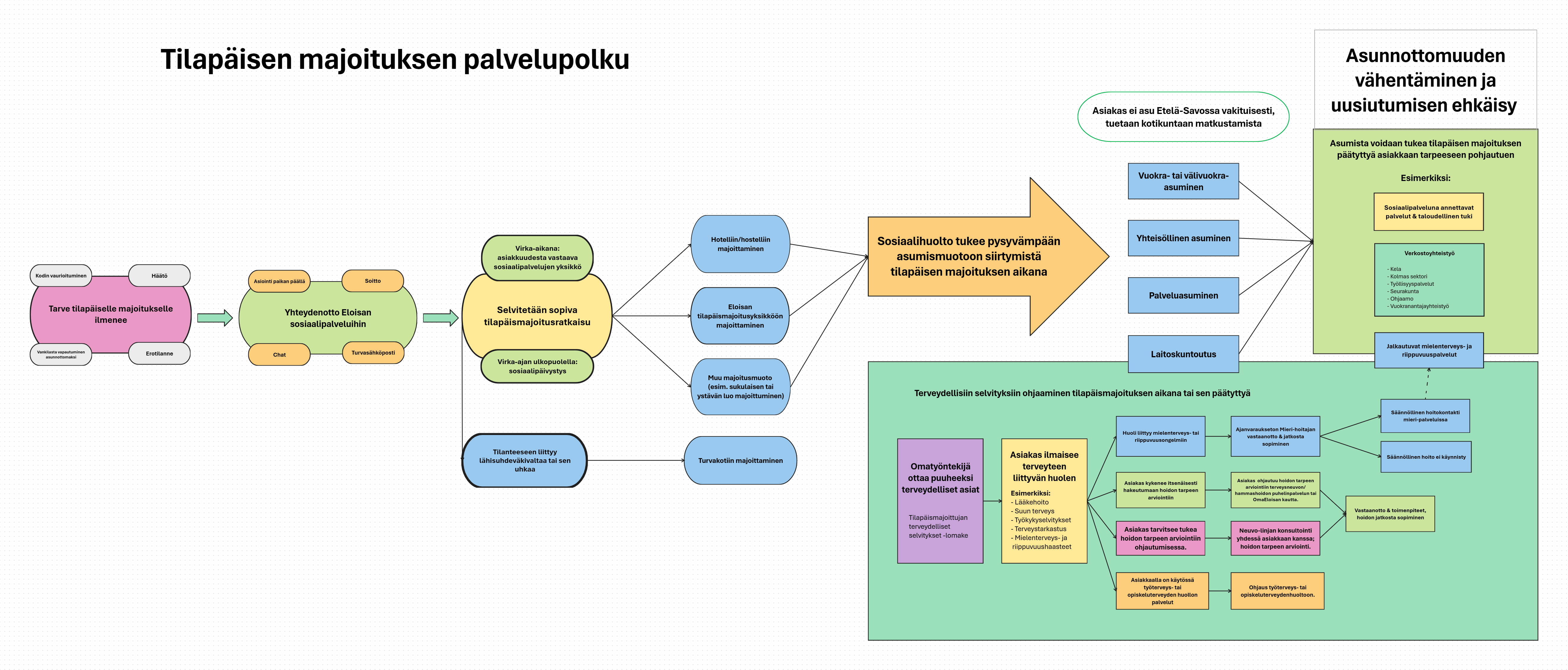 Etelä-Savon hyvinvointialueelle perustetaan maakunnan kaupunkeihin tilapäismajoitusyksiköt, joihin majoitetaan ensisijassa pitkäaikaissairaita henkilöitä. Tilapäismajoitusprosessin aikana tuetaan pysyvämpään asumisratkaisuun siirtymistä ja autetaan hoidon tarpeen arviointiin ohjautumisessa. Asumisen turvaamista tuetaan tilapäisen majoituksen päätyttyä hyvinvointialueen, vuokranantajien sekä muiden tukea tarjoavien toimijoiden välisen yhteistyön keinoin.