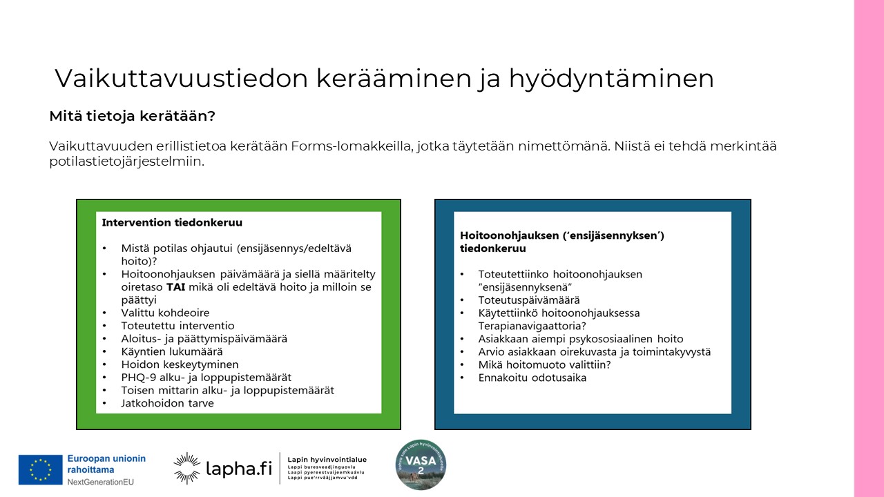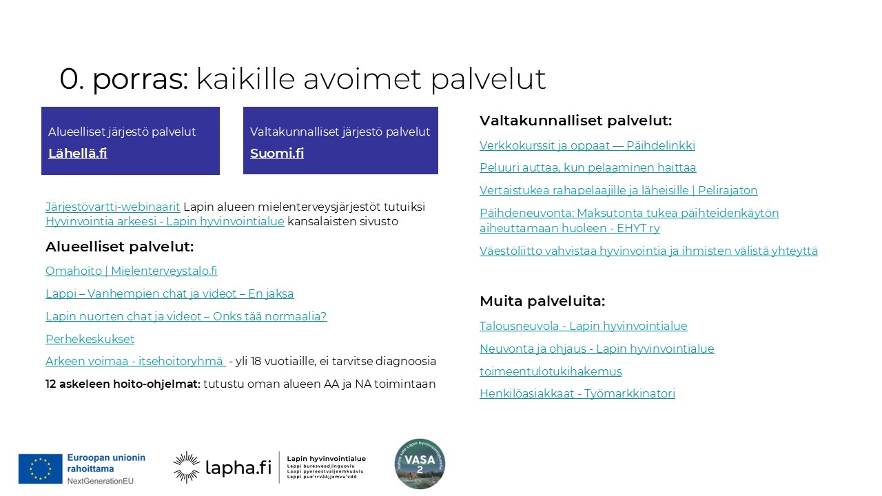 Lapin hyvinvointialueen mielenterveys- ja riippuvuuspalveluiden vastuualueen johdolla lähdettiin kehittämään psykososiaalisten tuen ja hoidon porrasteista hoitomallia, jota VASA 2- hankkeessa koordinoidaan terapiakoordinaattoreiden työpanoksella yhteistyössä Terapiat etulinjaan -hankkeen toimijoiden kanssa.