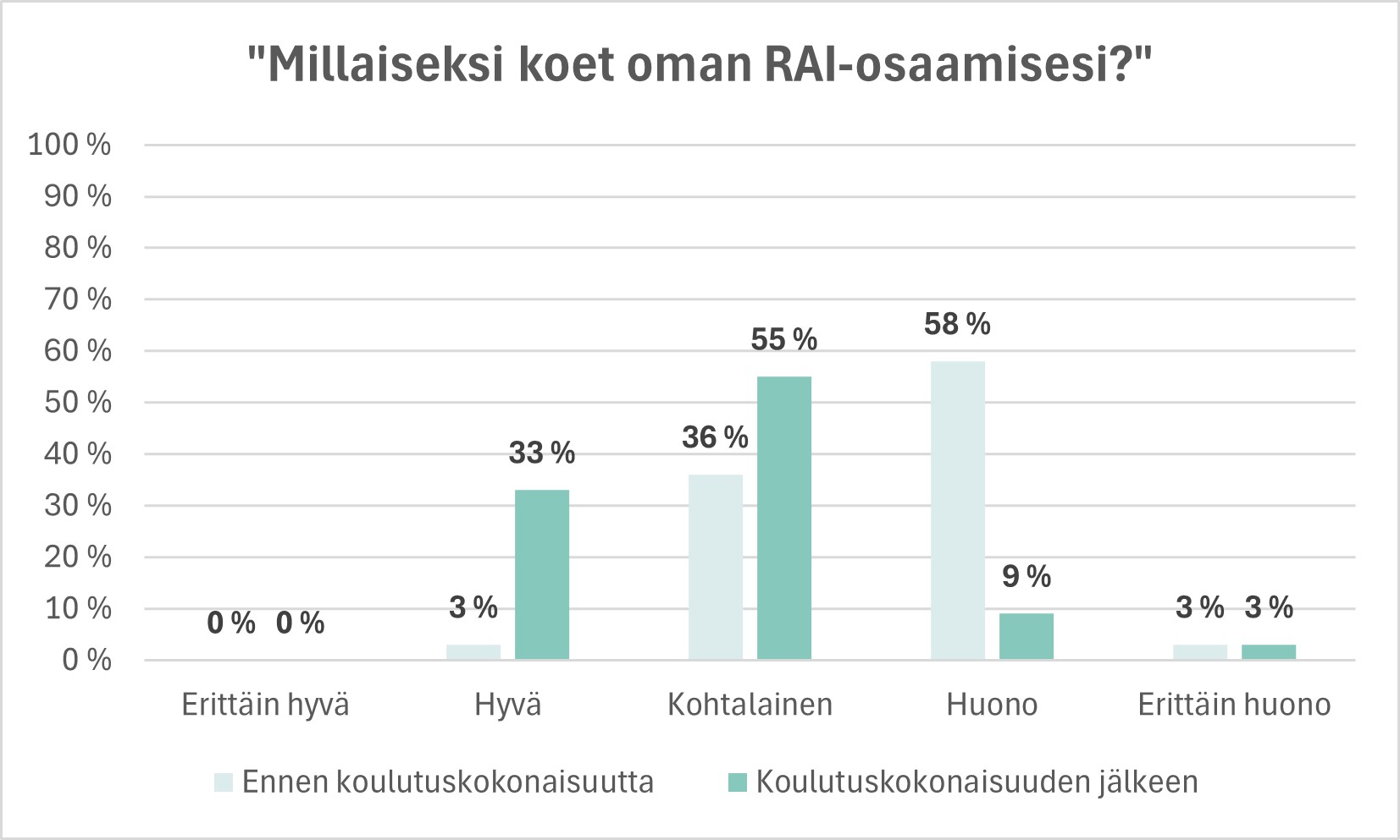 RAI-osaamisen muutoksen mittarina toimi ikäihmisten toimialalla työskenteleville lähijohtajille laadittu RAI-osaamisen kysely. Osaamistason nousua mitattiin kysymyksellä: "Millaiseksi koet oman RAI-osaamisesi?". Kysely laadittiin lähijohtajille ennen koulutuskokonaisuuden aloittamista sekä koulutuskokonaisuuden suorittamisen jälkeen.