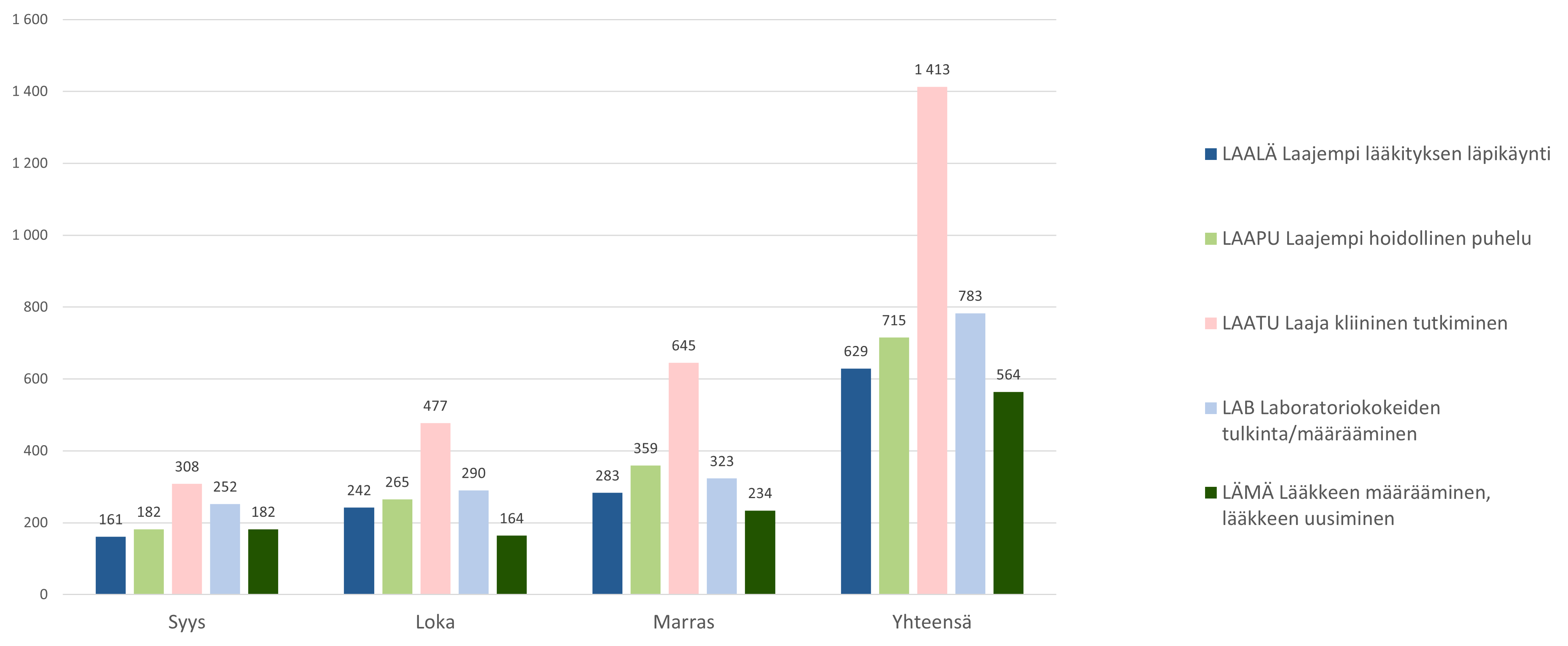 Olemme luoneet potilastietojärjestelmään sisältömerkinnän ja jaotelleet ne sisältöryhmiin; laajempi lääkityksen läpikäynti, laajempi hoidollinen puhelu, laaja kliininen tutkinta, laboratoriokokeiden tulkinta/määrääminen ja lääkkeen määrääminen, lääkkeen uusiminen. Tämän mittariston avulla voimme seurata lääkkeenmääräämishoitajien työnsisältöä.