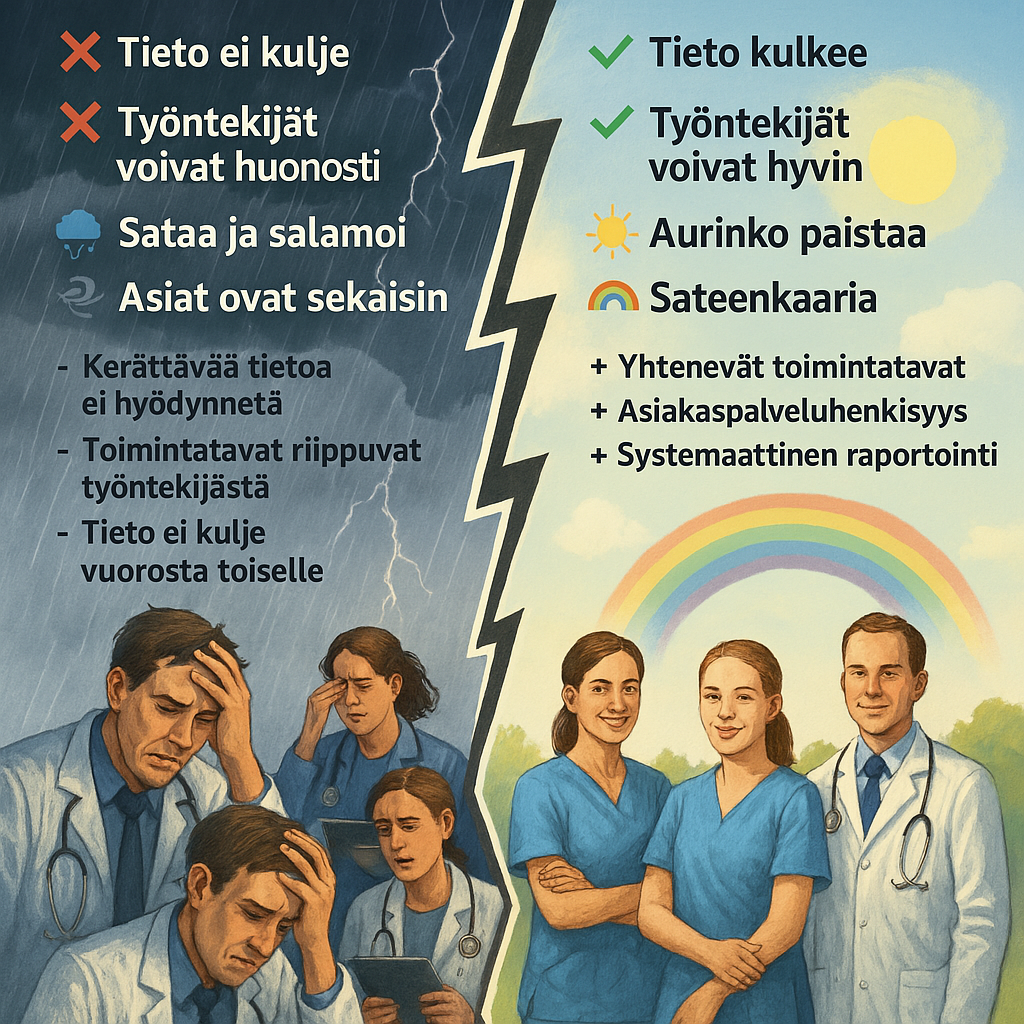 Saimme palautetta tiedonkulun katkeamisesta. Kehitimme rakenteiset raportointityökalut, joilla turvataan systemaattinen tiedonkulku vuorosta toiseen.