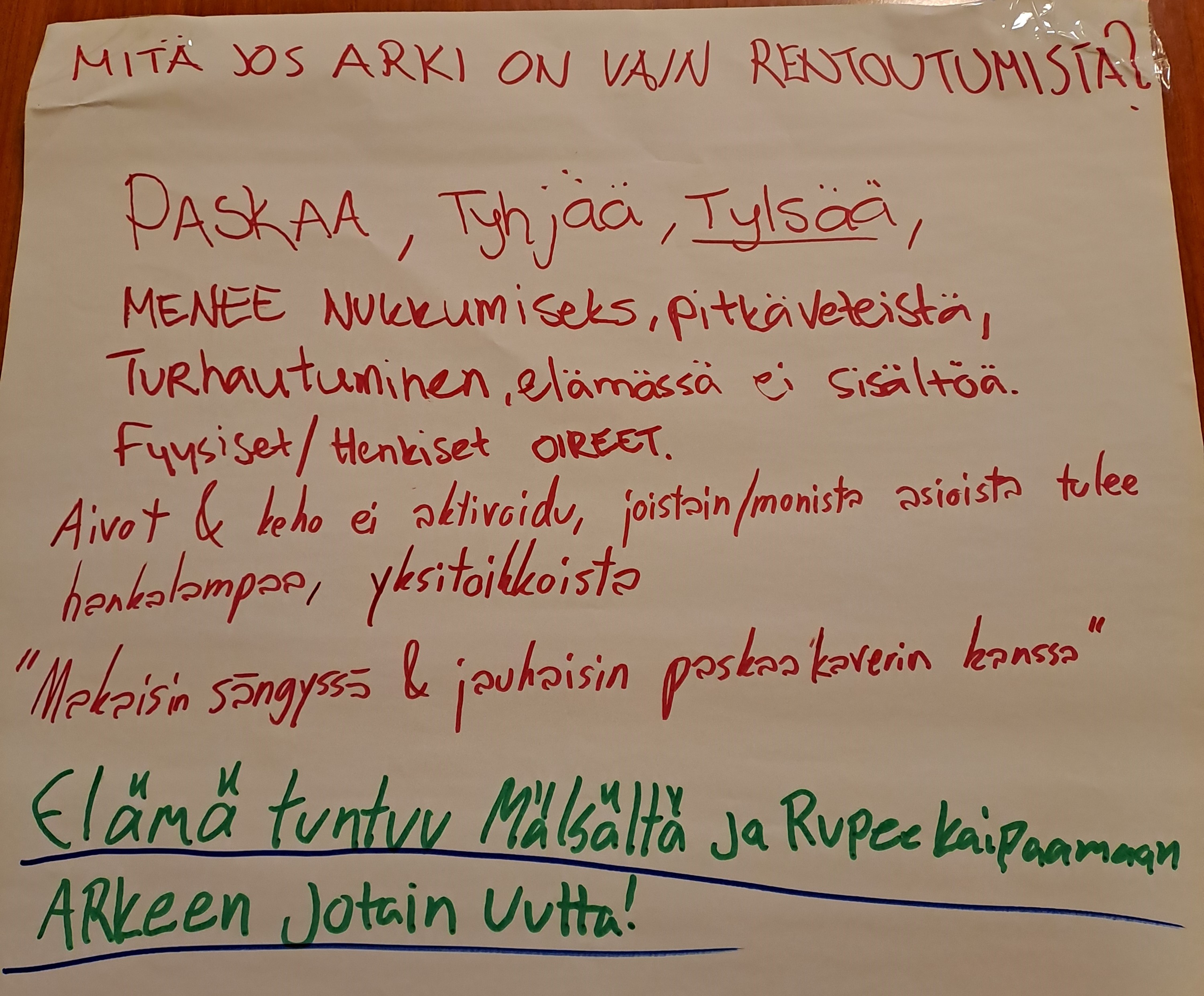 Kohderyhmänä mielenterveys- ja päihdekuntoutujat sekä mielenterveyden häiriön uhan alla olevat työikäiset. Kohderyhmän yhteisinä nimittäjinä ovat itseluottamuksen/minäpystyvyyden haasteet, merkityksellisyyden vähyys sekä arjen epäsäännöllisyys ravinnon, unen ja/tai liikunnan osa-alueilla. Yleisesti ottaen voidaan puhua kumuloituneita haasteita kokevista yksilöistä. Toiminnan alussa toimintaa kehitettiin pilottiryhmällä, jonka näkemykset ja kokemukset yhdistettynä alueemme asiakkaita kohtaavien ammattilaisten näkemyksiin loivat selkeät rakenteet toimintamallillemme.