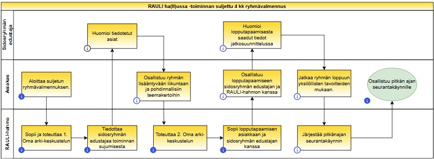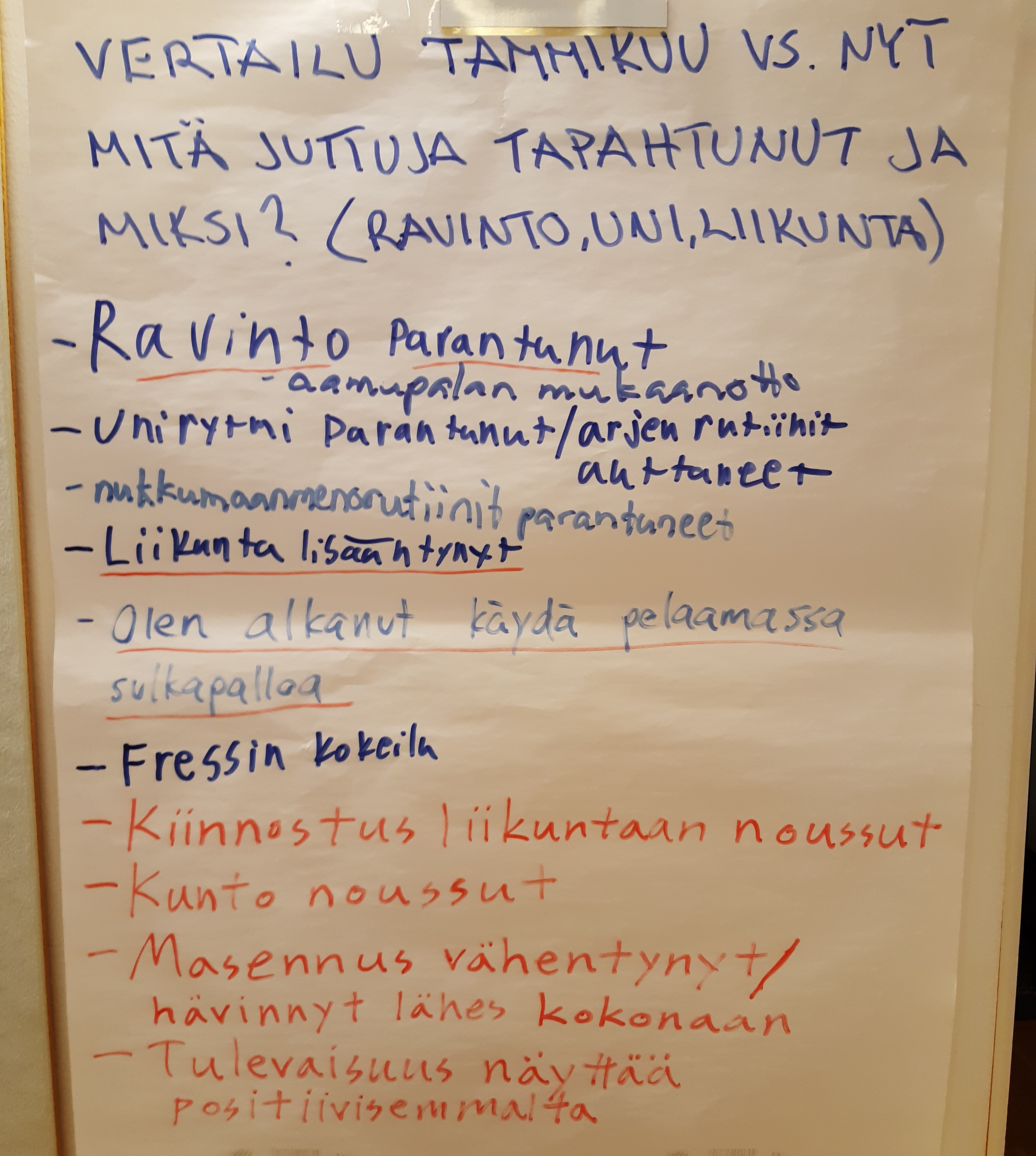 Mielenterveys- ja päihdekuntoutujien erityispiirteet huomioiva elämäntapaohjausmalli ravinnon, unen ja liikunnan osa-alueille. Ei luentoja vaan konkreettista tekemistä suljetun ryhmän tukemana. Keskiössä oman toiminnan vaikutus hyvinvoinnille.