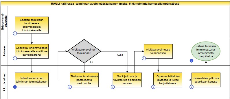 Toiminta tapahtuu Lahden alueen toimintaympäristössä. Toimintaympäristön muodostavat asiakkaat (mielenterveys- ja päihdekuntoutujat sekä mielenterveyden häiriön uhan alla olevat työikäiset), sidosryhmät (asiakkaita kohtaavat tahot, esim. psykiatrian poliklinikat, sosiaalityö, etsivä nuorisotyö, työllisyyspalvelut jne.) sekä alueen liikuntapaikat ja liikunta-alan toimijat. Tarkoituksena ei ole valmentaa mahdollisimman hyväkuntoisia ja taitavia liikkujia, vaan osoittaa asiakkaan oman konkreettisen toiminnan sekä omien kokemusten kautta että omaan hyvinvointiin voi vaikuttaa ja että asiakas pystyy toimimaan oman hyvinvointinsa eteen mm. hyödyntämällä alueen liikuntamahdollisuuksia.