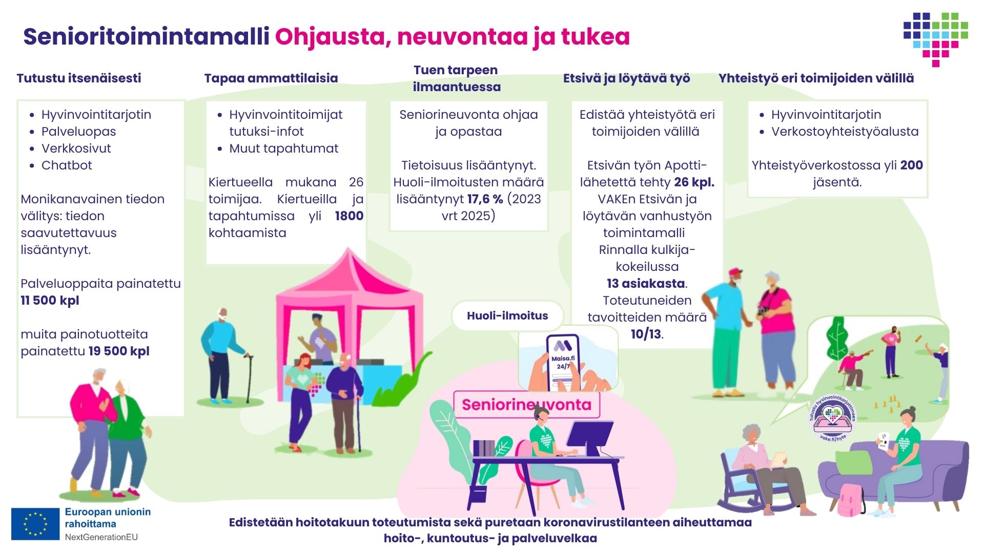 Senioritoimintamallissa luodaan hyvinvointialuetasoinen etsivän- ja löytävän vanhustyön toimintamalli sekä kehitetään ohjausta ja neuvontaa.