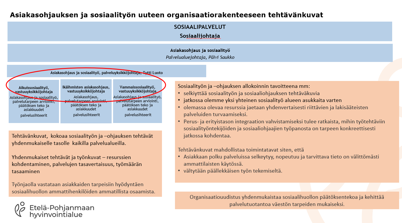 Sosiaalityön ja sosiaaliohjauksen ammattihenkilöiden tehtävänkuvien muutoksilla pyritään tarjoamaan asiakkaalle joustavammin ja kokonaisvaltaisemmin hänen tarvitsemansa palvelut. Tarve asiakkaan ohjaamiseen muille palvelualueille vähenee ja asiakas saa nopeammin ja vähemmillä kontakteille ratkaisun asiaansa ja tarvittaessa tarvitsemansa tuen ja/tai palvelun.