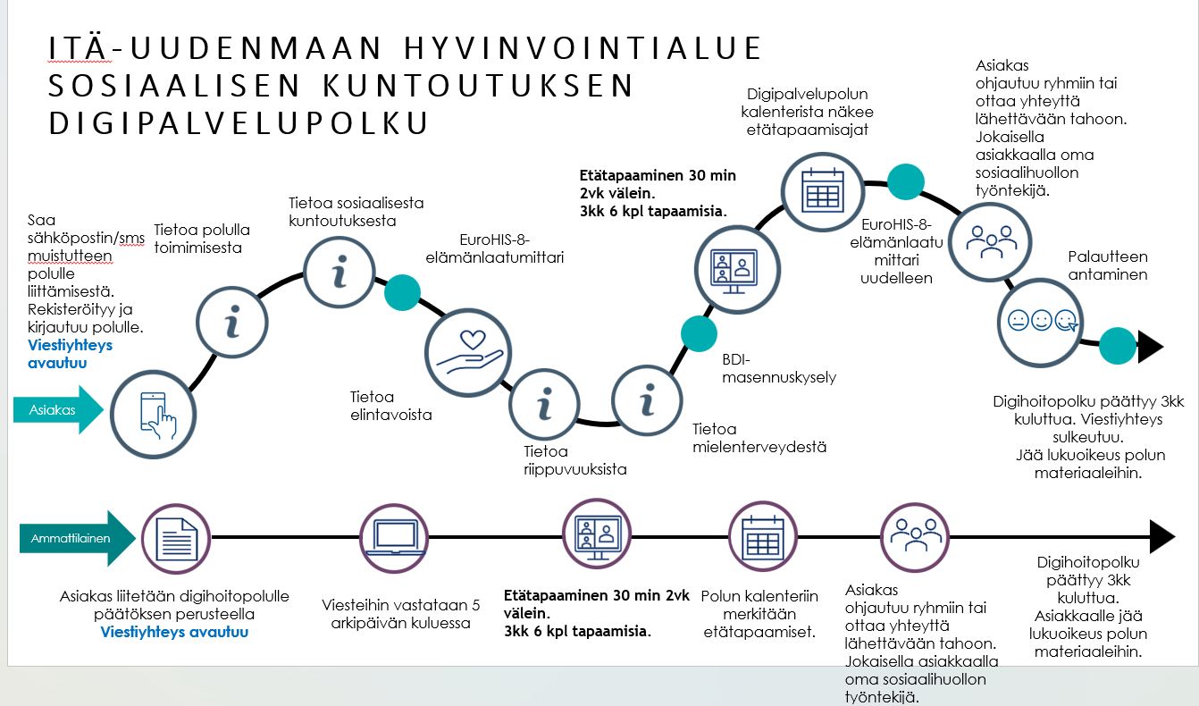 Itä-Uudenmaan hyvinvointialue, perhe-ja sosiaalipalveluiden digipalvelupolku sosiaalisen kuntoutuksen asiakkaille.