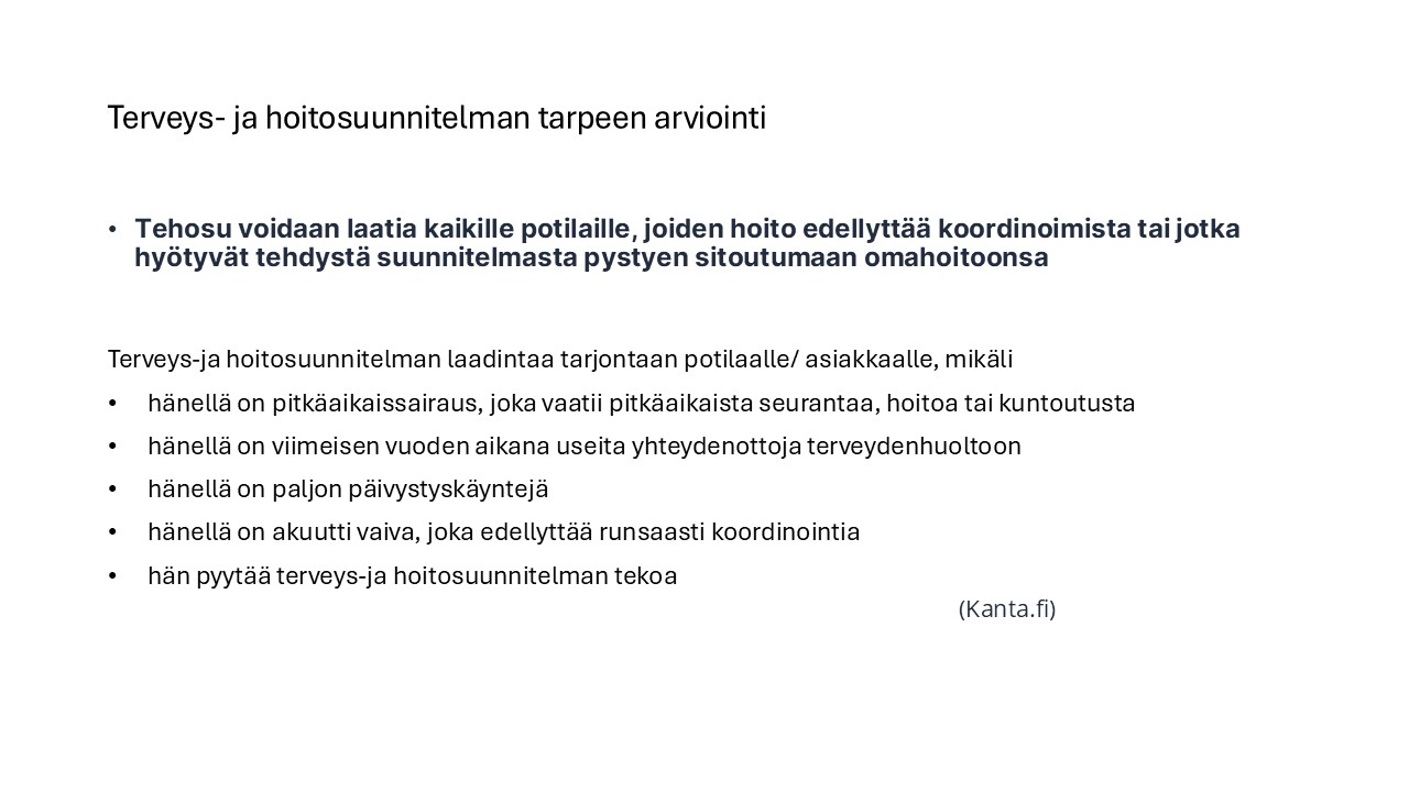 Terveys-ja hoitosuunnitelma (tehosu) laaditaan paljon palveluita tarvitseville ja pitkäsaikaissairaille, joiden hoito edellyyttää koordinointia ja jotka hyötyvät suunnitelmasta. Sitä voidaan hyödyntää perusterveydenhuollossa ja erikoissairaanhoidossa