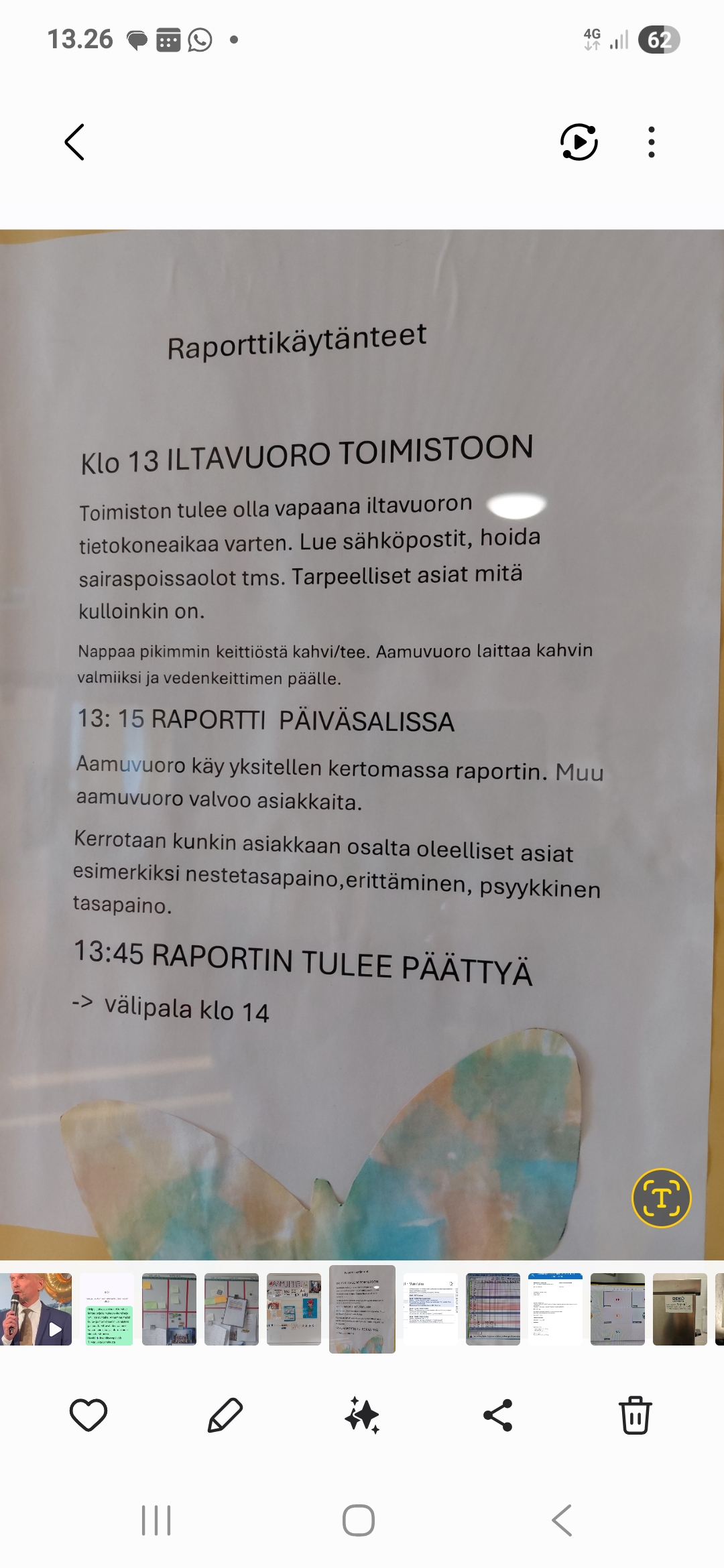 -Raportointikäytänteiden parantaminen: Työvuorosuunnittelu>iltavuoro alkaa kaikilla samaan aikaan 13.00, tämän jälkeen 15min aikaa lukea sähköpostit ym. ennen raportin alkua 13.15, raportin pitopaikkana on aina päiväsali, jossa aamuvuoro käy vuorotellen kertomassa oman raporttinsa, raportti on strukturoitu.