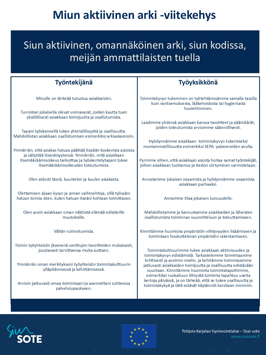 Koko Siun soten kotihoidon, asumispalveluiden ja terapiapalveluiden henkilöstölle pidettiin työpajat, joihin osallistui melkein 200 osallistujaa. Näiden työpajojen tuotosten pohjalta rakennettiin Miun aktiivinen arki – viitekehys. Viitekehys toimii yksiköiden tukena toimintakulttuurin muutoksessa.