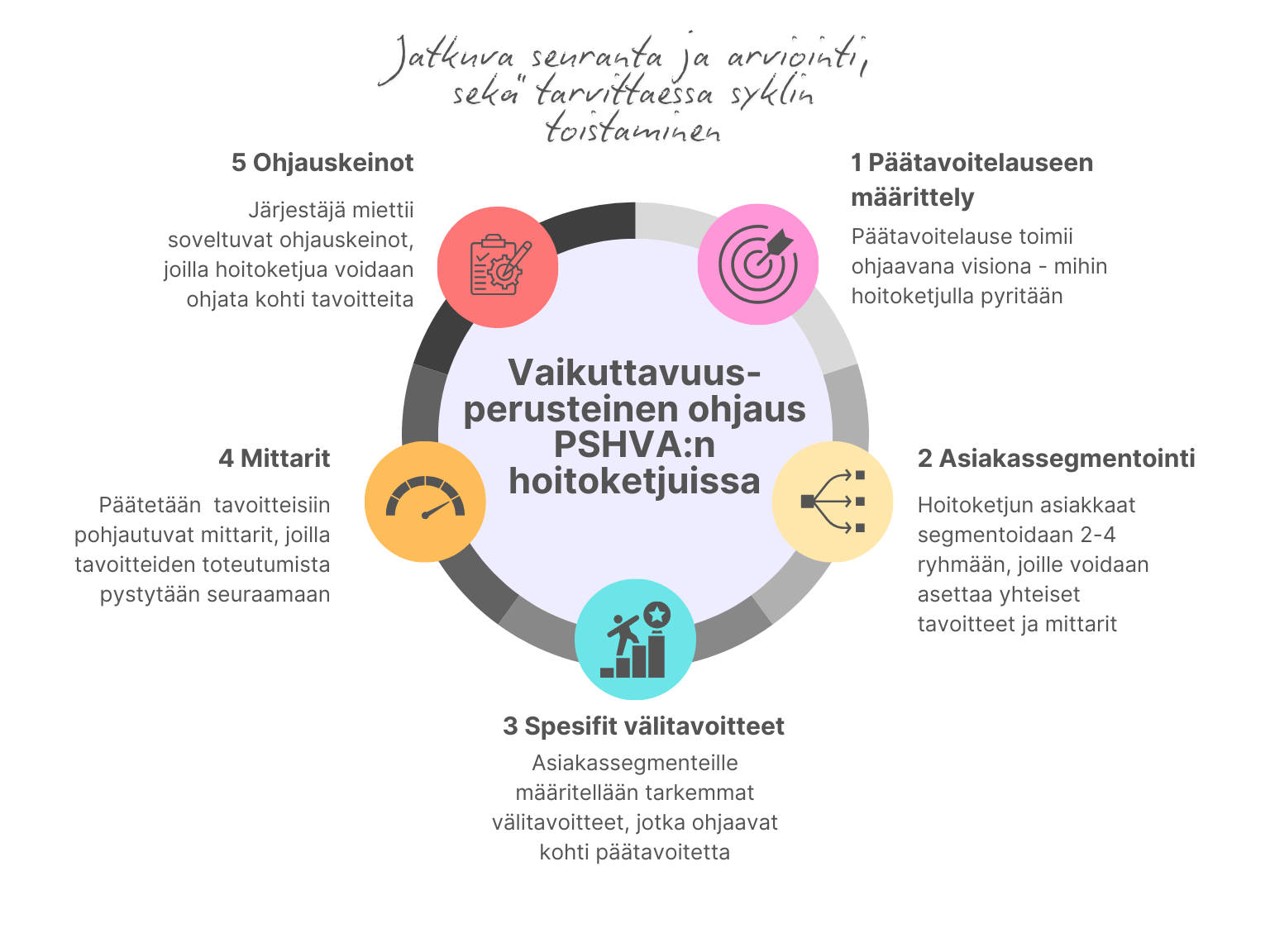 Käytännönläheinen toimintamalli, jota voidaan soveltaa hoitoketjutyön jälkeen yksittäisen hoitoketjun vaikuttavuusperusteisen ohjauksen suunnitelman luomiseen. Sisältää 8 työpajaa, jotka toteutetaan palvelutuotantoa osallistaen.