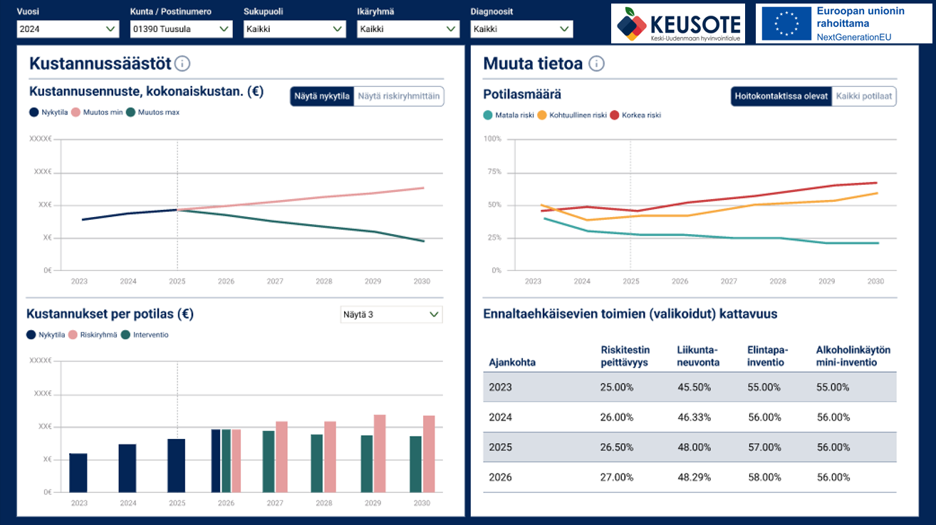 Valtimosairauksien ennustemalli on väestötason dataan perustuva tiedolla johtamisen työkalu, joka tuottaa ennusteita valtimosairauksien riskiryhmistä ja kuormituksesta hyvinvointialueella.