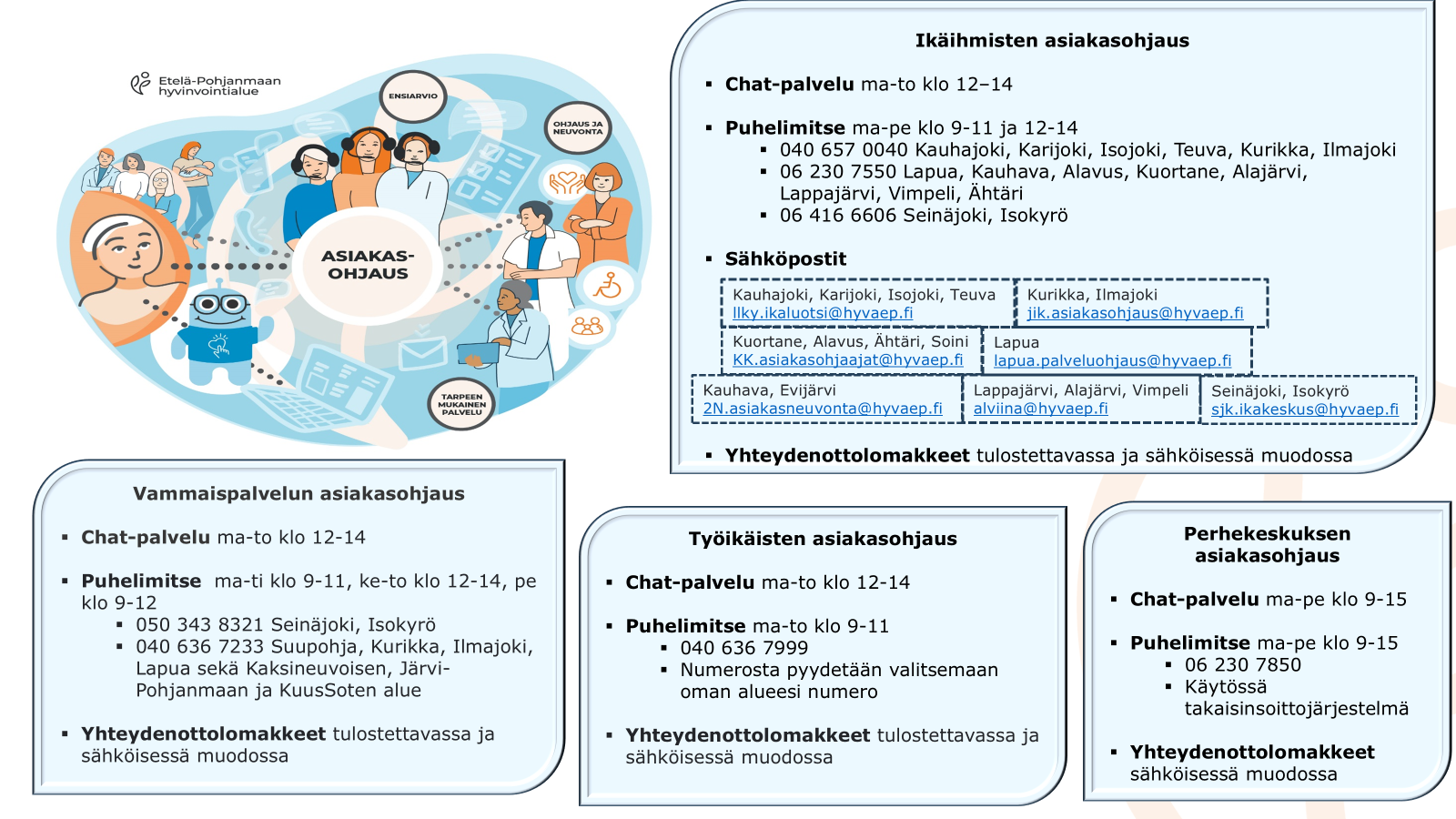 Etelä-Pohjanmaan hyvinvointialueeseen kuuluu 18 kuntaa, joiden sosiaali- ja terveyspalvelut on tuotettu vuodesta 2023 alkaen kahdeksassa sosiaali- ja terveyskeskuksessa. Asukkaita alueella on noin 192 000. Vammaispalveluiden asiakasohjaus on osa asiakasohjauksen ja sosiaalityön palvelualuetta.